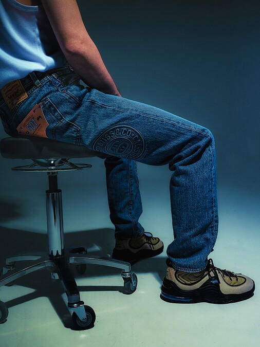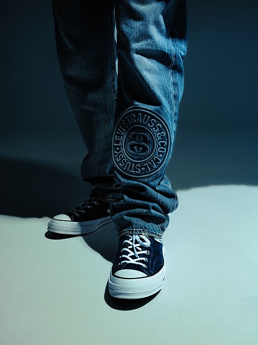 承襲501牛仔褲的原創合身剪裁,採用粗獷、仿舊的靛藍色水洗面料,特別在左前褲管和右後褲管上加入Stüssy & Levi's®立體壓紋圖案,並在臀部放上Levi's® Two Horse Pull和Stüssy聯名標籤,不僅巨大吸睛更別具紀念意義。