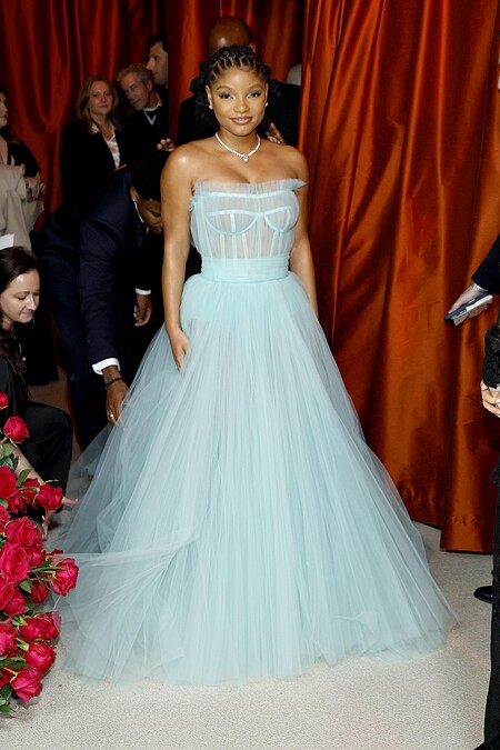 小美人魚Halle Bailey一襲淡雅的水藍色禮服,由上身馬甲+下身公主澎裙組合而成,頸間綴以鑽石項鍊,簡單大方又有氣質。
