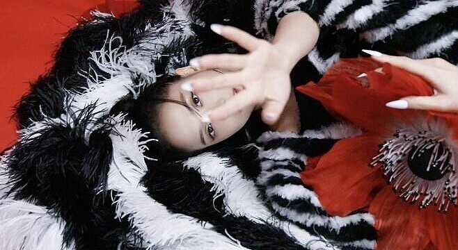 最新釋出的專輯《ME》預告片,Jisoo選擇Jean Paul Gaultier黑白對比的流蘇長裙,與鮮豔的紅色花朵形成強烈對比,展現古典又帶點怪誕的氣息。