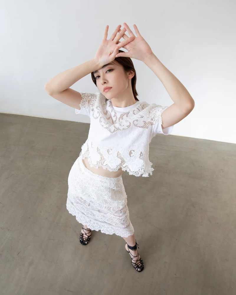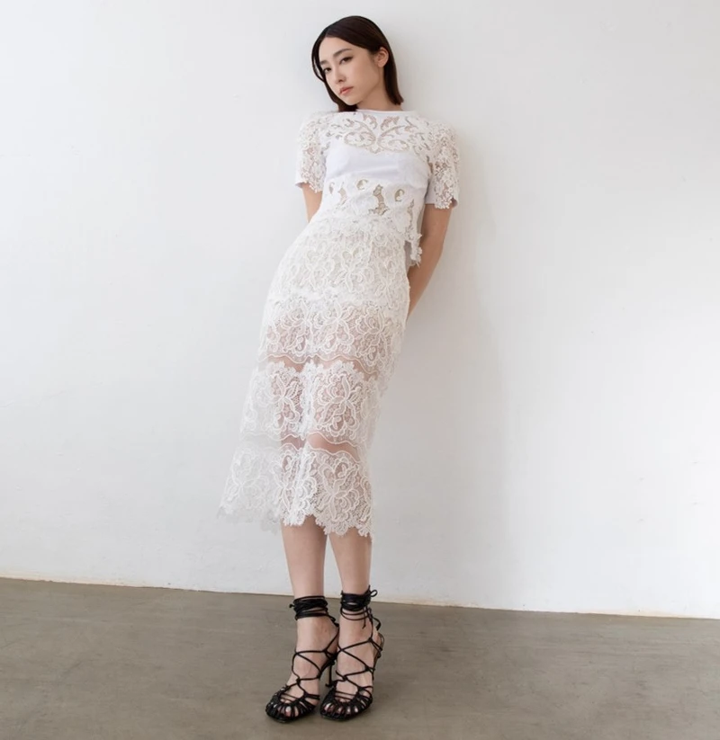 ERMANNO SCERVINO最引以為傲的「蕾絲」當然也不會在春夏系列中缺席,以休閒短T作為基底更換蕾絲材質搭配魚尾裙,不同蕾絲拼接、休閒正式的恣意混搭,融在一起優雅卻及有個性,拆開也能各自與其他基本款單品搭配,可說是百變穿搭的首選,唯一不變的是現代女子對於生活中各種精細質感的純粹追求,以及品牌始終不變的DNA精神。