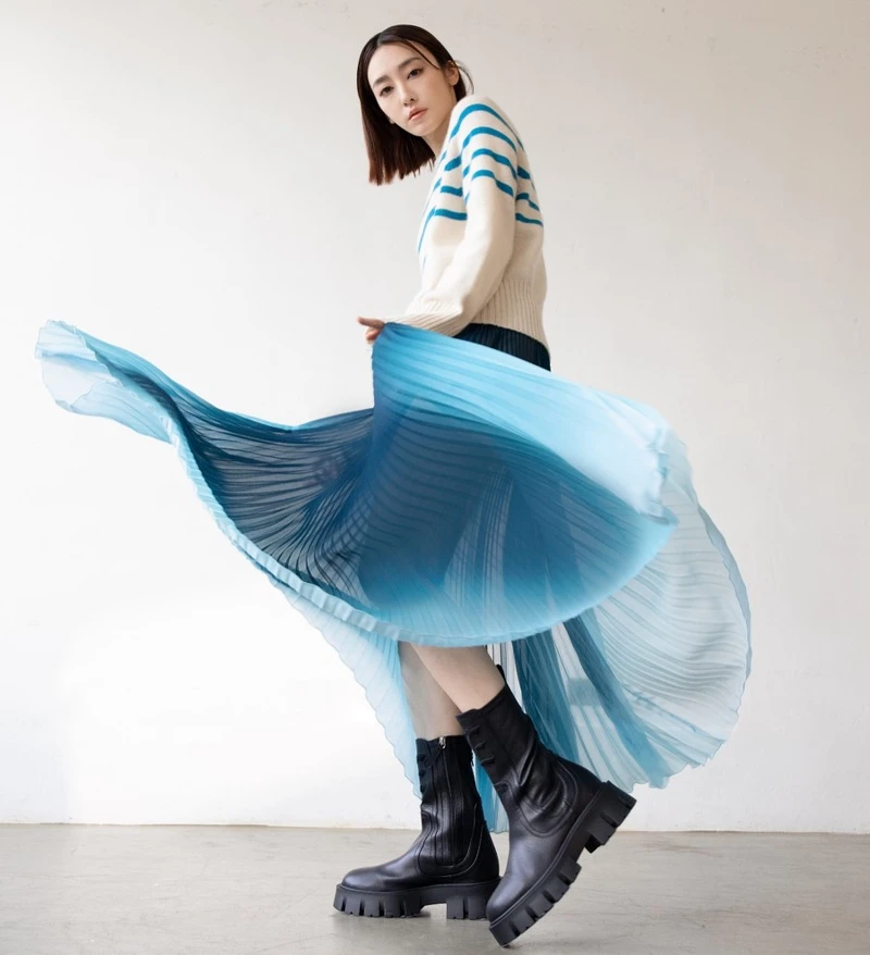 經典條紋針織衫搭配飄逸百褶裙,透過深淺透膚漸層設計與帥氣靴款打造出反差衝突感,讓本是優雅氣息濃厚的優雅單品組合造型,擁有了別樣現代女子的自我主張與個性態度。