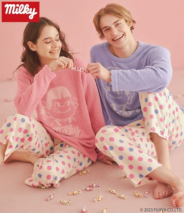 採用針織和法蘭絨材質製作成睡衣組,女生的上衣是Peko醬、下身則為糖果紙的經典包裝。