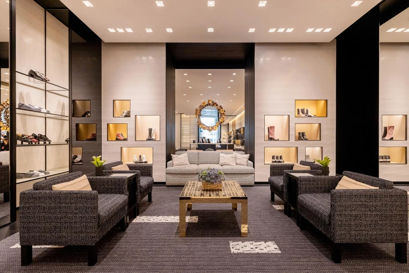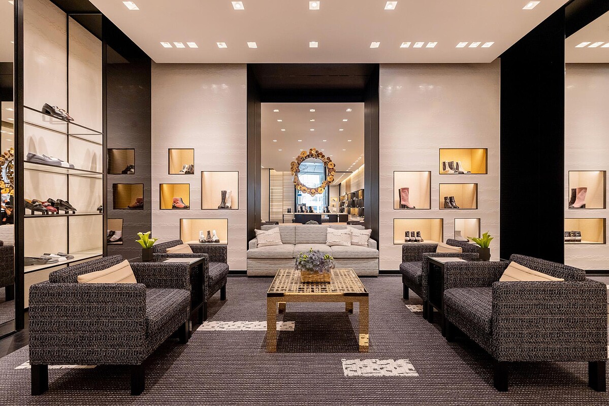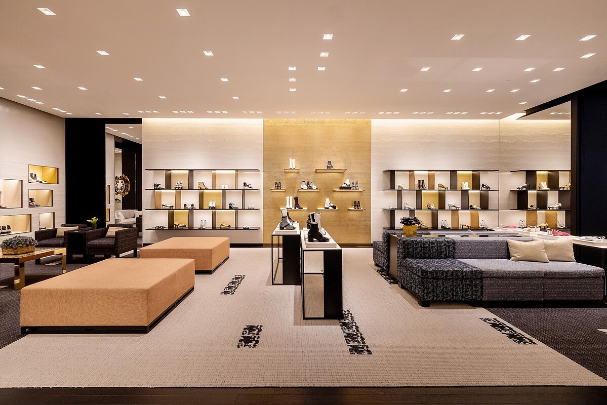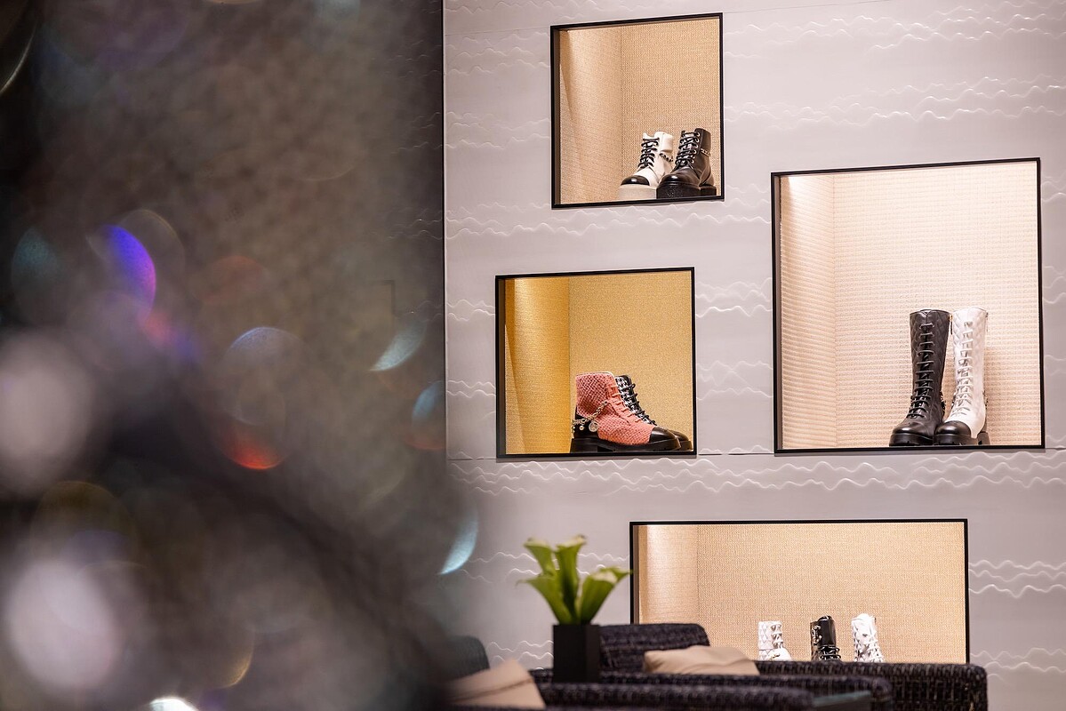 無論你是愛鞋成痴,或是資深的小香迷,一來到店門口,一定都會被落地的透明櫥窗以及華麗的金色展示台上的美鞋所吸引。走進店裡更是另一番美感享受,質感的黑色漆木地板,配以斜紋軟呢地毯與沙發,畫龍點睛式地點綴上金色牆面與藝術掛飾,呼應Chanel之於藝術領域的投入與喜愛。