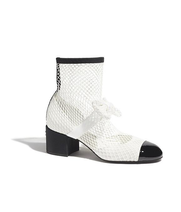 沿用雙色鞋的經典符碼,變奏成瑪莉珍版型的短靴,綴上甜美的蝴蝶結裝飾,有的同樣以閃閃惹人愛的水晶製作、有的則為低調的霧面樣式,網狀細節打造出的透視感,誰說夏天不適合穿靴子?