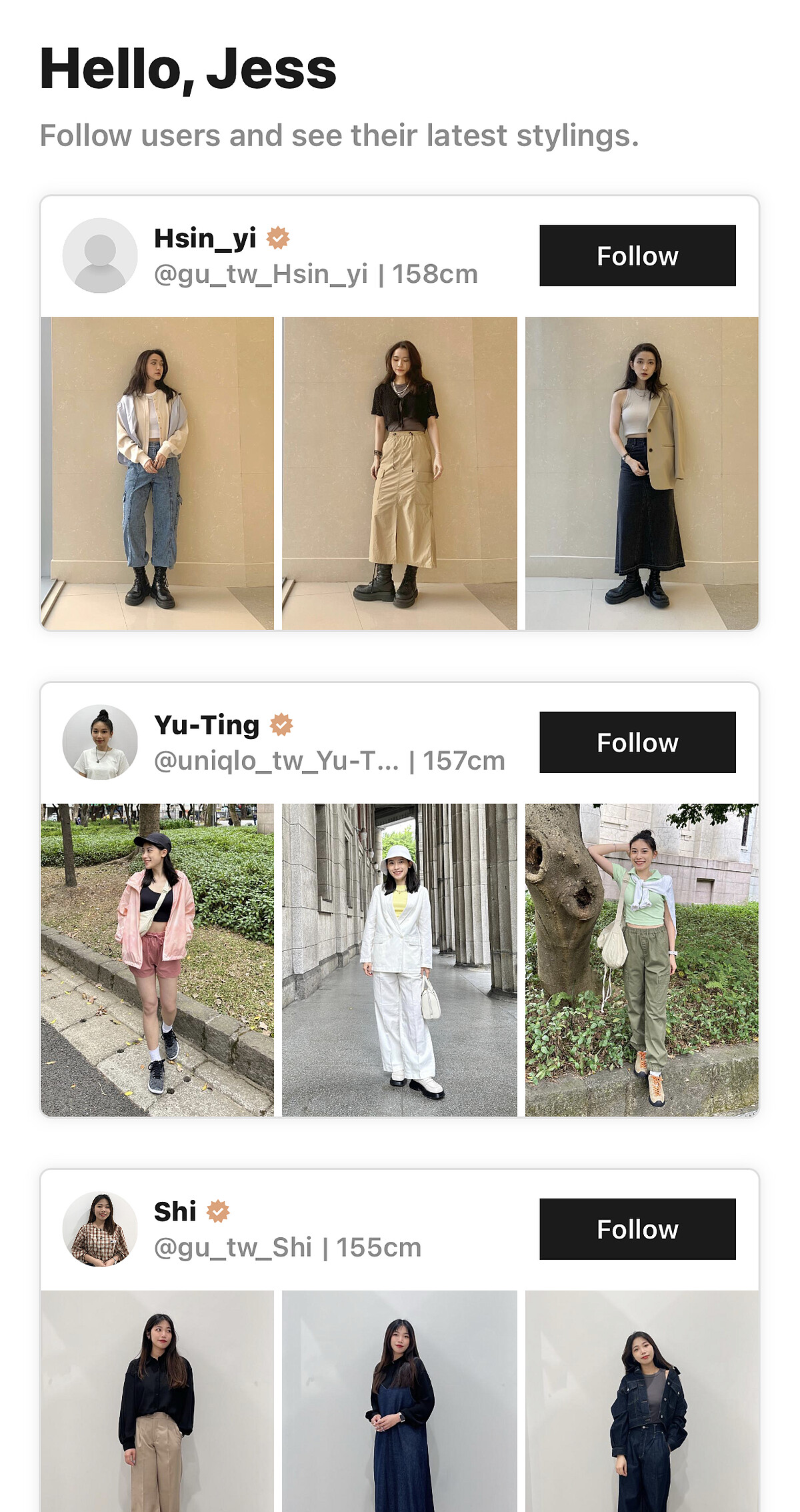 買衣服最怕拿回家後,不知道如何該衣櫃裡現有的衣服搭配。GU和Uniqlo共同推出穿搭app「Style Hint」合作,集結各種不同風格的穿搭分享。Style Hint初步提供每位分享者的身高資訊,並整合了照片裡的同款單品連結於下,省去大家自行搜尋的時間,宛如一本隨身穿搭參考書。