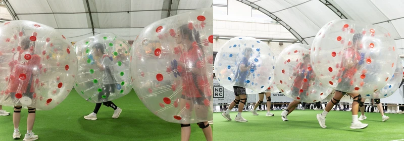 除了活力熱血的個人賽,需要動用團隊精神的泡泡足球更是這次畢業考的一大看點!雙方隊伍穿上泡泡球後進行足球運動,每個團隊不僅要靠勇氣、力量發揮絕佳默契,展現活力與智慧的戰術取得射門機會也很關鍵。雖然獲勝很重要,但看到大家用上千方百計搶球得分實在是刺激又有趣,場上歡笑聲、尖叫聲不斷,可見學員們都玩得超開心,有同伴們一起運動一起激勵彼此真的是件愉悅的事。