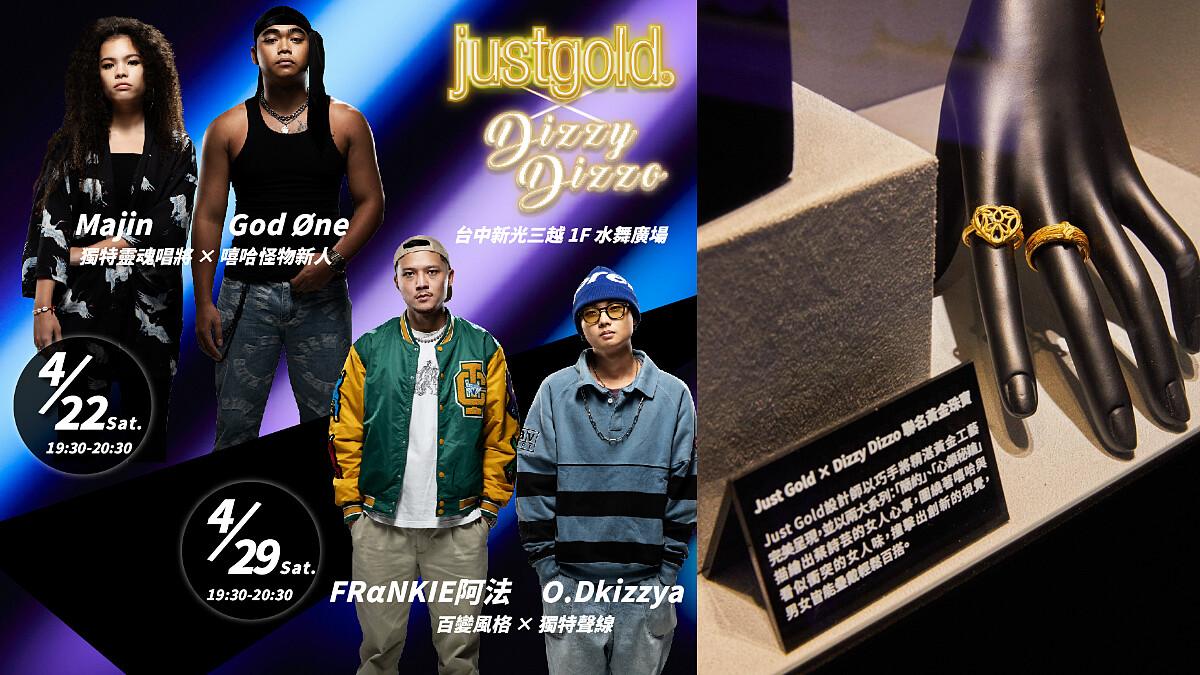 Just Gold鎮金店藉由與Dizzy Dizzo蔡詩芸的合作,頌揚女性跳脫傳統的自信態度,表彰真女人的精神理念,「靜態 Runway 時尚秀」目前正在台中新光三越一樓水舞廣場熱烈展演中!活動至5/1(日)止,於巡展現場拍照打卡,更有機會獲得精美禮物,不論你是喜愛金飾珠寶或是本身也是大嘻哈時代的粉絲,都絕對不能錯過這場超豐富的嘻哈饗宴!