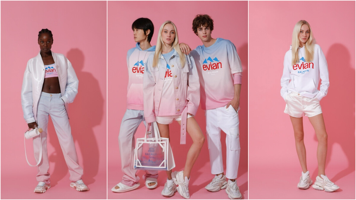 Balmain x Evian盛夏膠囊系列以"Together, change is beautiful"為概念,著重於未來時尚可持續發展的強大可能性,基於兩大品牌同樣對於人權及環保意識的重視,全系列大量使用各種回收材料與環保製造過程,Balmain 創意總監Olivier Rousteing及團隊巧妙地將品牌經典設計、運動裝與Evian包裝上歡快的粉彩漸變色調相結合,打造出時髦並兼具永續性的作品。