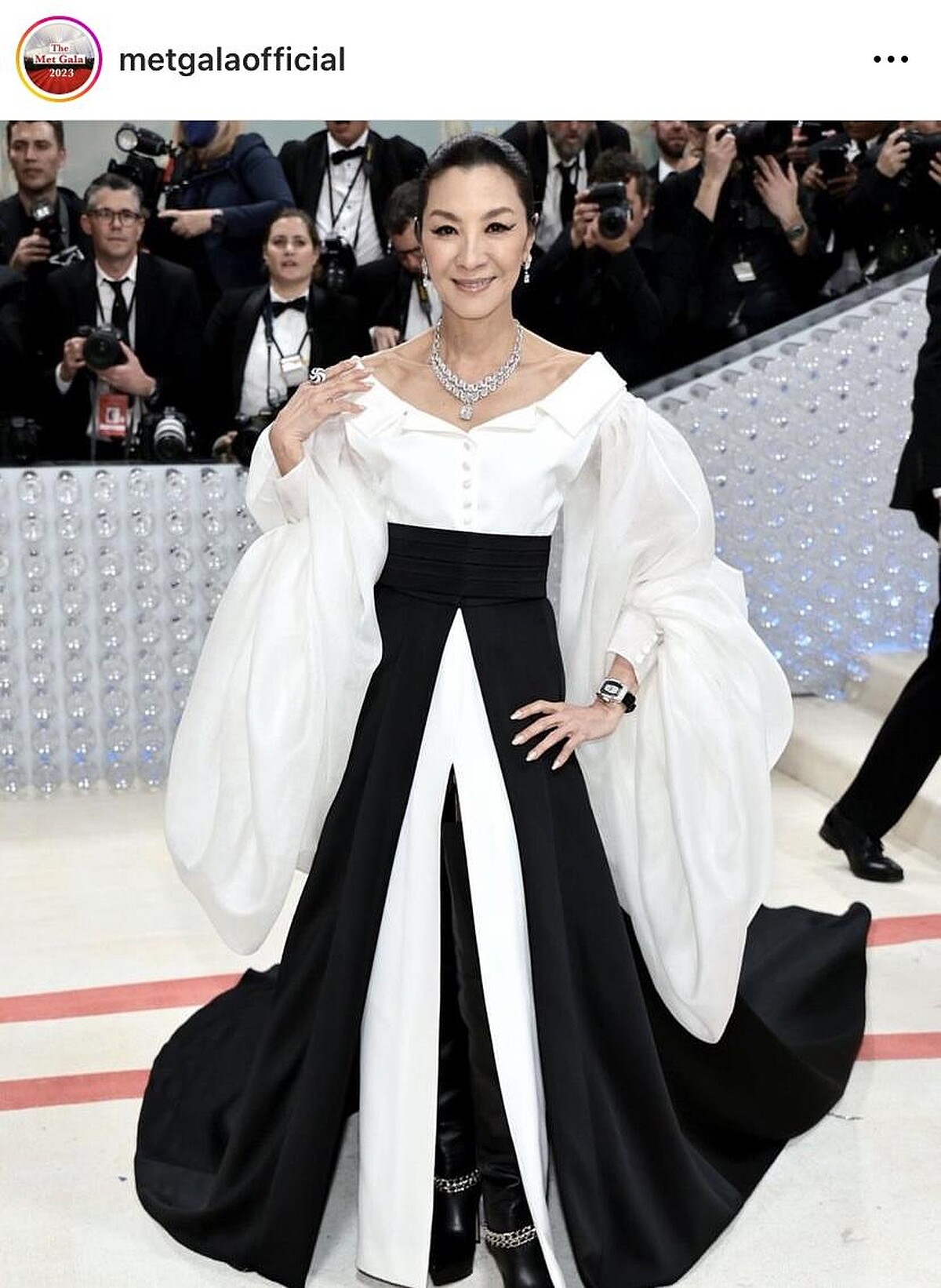 以《媽的多重宇宙》一片成為奧斯卡金像獎的第一位亞裔影后,楊紫瓊在Met Gala的造型同樣霸氣十足。結合現代西裝細節以及歐式晚禮服的蓬袖設計,黑白相間同時也呼應老佛爺的經典配色;搭配幾何線條的珠寶以及Richard Mille黑白腕錶,帥氣的影后女王風範。