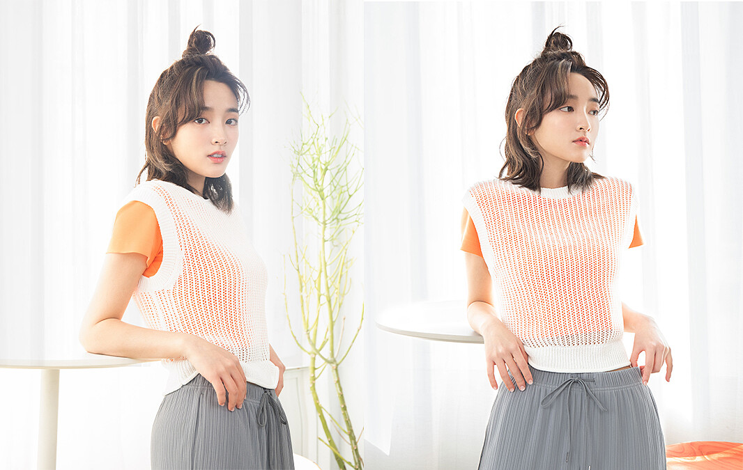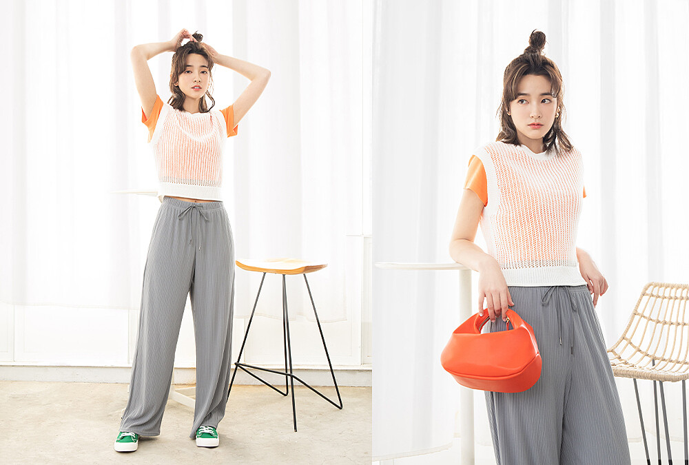 GU超有感美型輕便褲是王淨包色全入手的心頭好,更是她強力激推的經典定番單品,色調眾多加上柔軟羅紋材質與鬆緊帶設計,略微寬鬆的版型不僅可以修飾腿部線條,酷暑季節穿著起來既舒適也不會有悶熱感,可說是夏日最該秒收的最強單品,超適合用來搭配清爽降溫的休閒裝扮。王淨自己則是將合身鮮橘短版TEE內搭在網狀背心營造出不悶熱的層次感,拿上與內搭相同色調的手提包,透過灰色調美型輕便褲來平衡視覺色調,完美呈現同時擁有涼爽與時髦的多樣可能性。