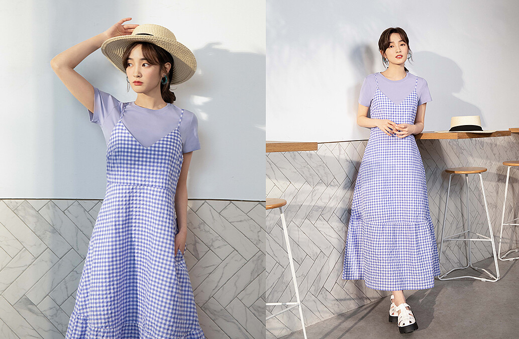 淡紫色格紋圖案與裙襬拼接設計的細肩帶連身裙,是王淨一看就愛上的夏日推薦必收單品,她說:「穿上這款連身裙瞬間就有置身仲夏假期的即視感,海灘度假可以單穿、逛街下午茶可以內搭短TEE或背心,搭配上撞色亮綠色托特包與藤編帽,兼具精緻浪漫與自在隨性的多重氛圍感,是每個女生都該入手一件的懶人時髦單品。」