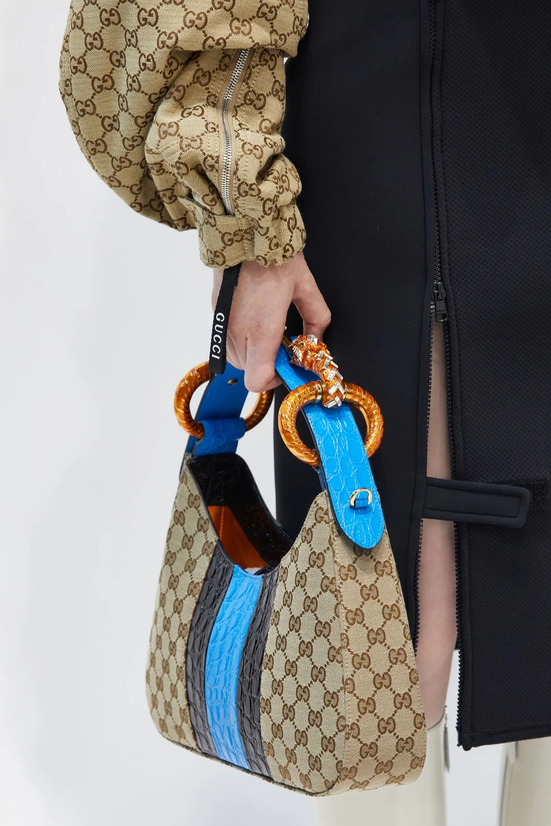 至於配件,熱賣款式如Horsebit肩背包上的馬銜鍊標識刻意扭曲或縮小、色彩鮮艷的圓梯形馬銜鍊包款、以1990年代末期的潛水靴為藍圖並重塑的淺口平底鞋、融合經典織帶及圓潤線條的Ace系列運動鞋,都在早春系列有十分搶眼的詮釋,令人心動。