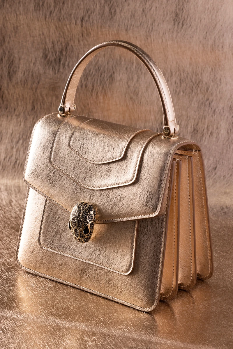 為慶祝Serpenti 75周年,寶格麗替FOREVER包型換上淡金色的小牛皮,並以層壓鋁箔熱軋細膩加工,締造出類似於的鑽石原礦紋理的效果,標誌性靈蛇頭的部分也不忘花點心思,鑲嵌黑色鋯石與過往做出區別。