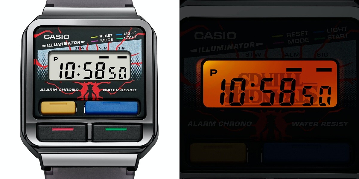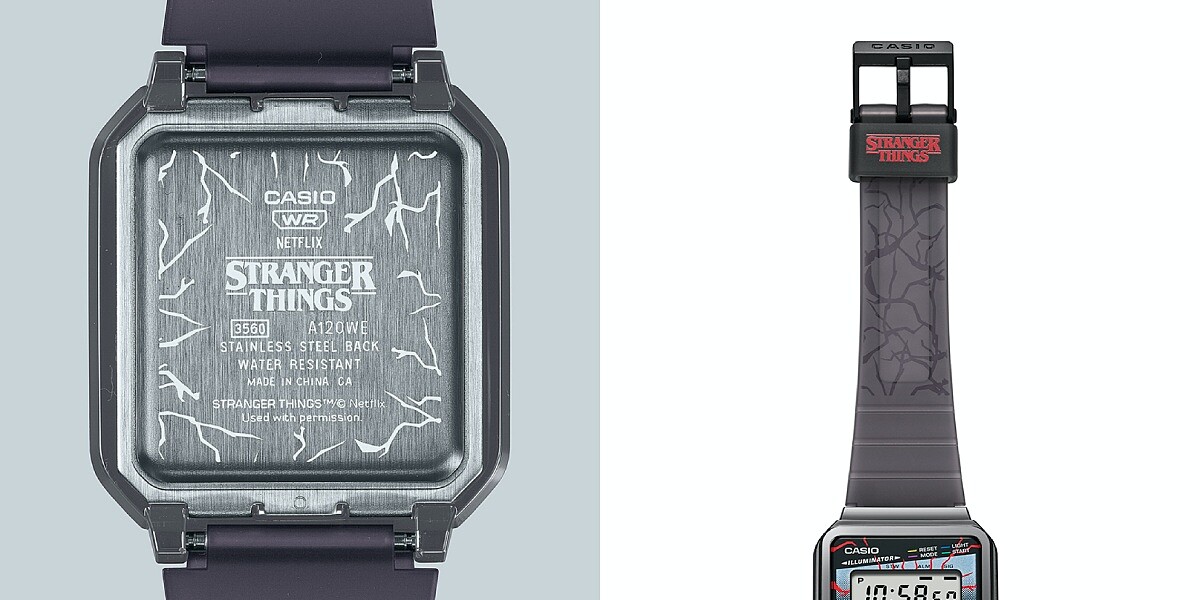CASIO與《怪奇物語》這次合作推出聯名,特別選擇了以1980年代發行的數位錶款A120作為基礎延伸設計的A120WEST款式,並從錶盤上的功能按鍵色系開始就是鮮艷搶眼的黃、藍飽和色,錶盤中心以《怪奇物語》劇中經典「花瓣頭」魔神(Demogorgon)點綴,為這款錶增添了不少劇中的恐怖氛圍。