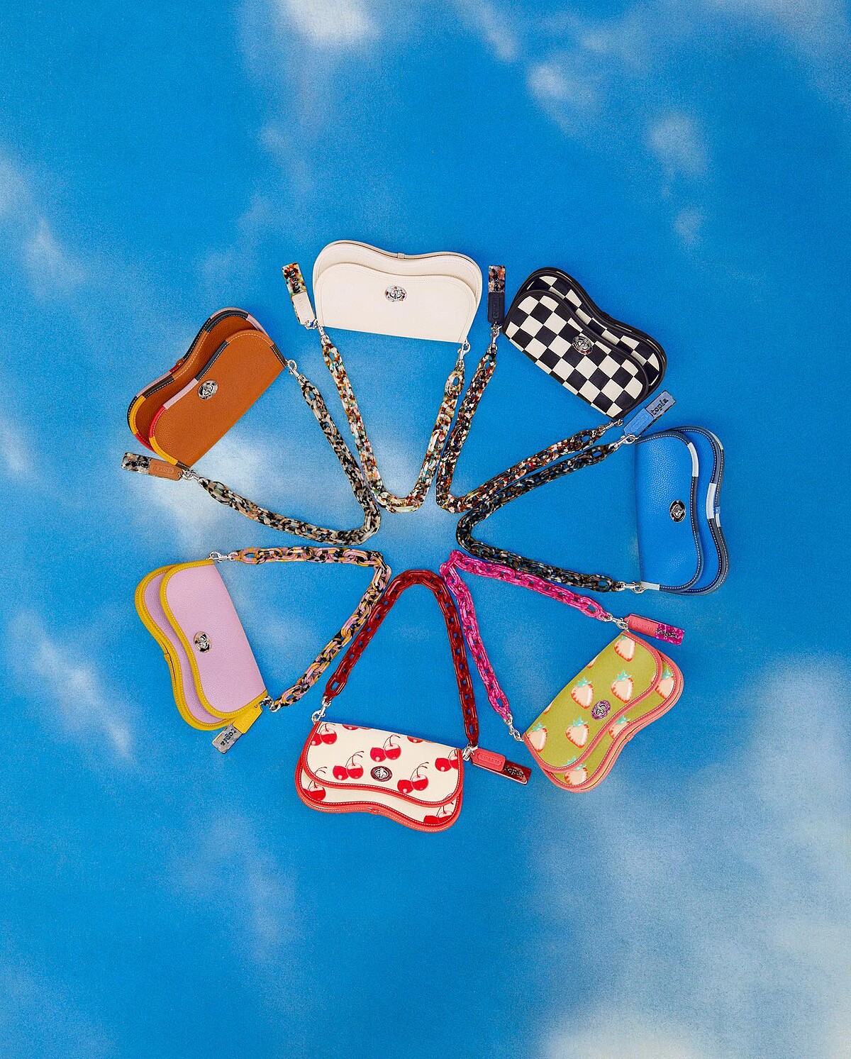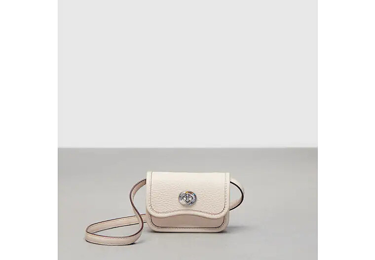 取自Coach 1973年曾推出過的一款背包,Wavy Dinky俏皮的波浪輪廓,特別的是扣式與鏈狀背帶是由回收的樹脂點綴而成,繽紛色彩為包包注入一股活潑氣質。
