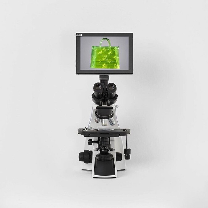 MSCHF「微型LV包」由感光樹脂製成,以透透的螢光綠色呈現,也單純是方便於顯微鏡燈光照射下看見而已。