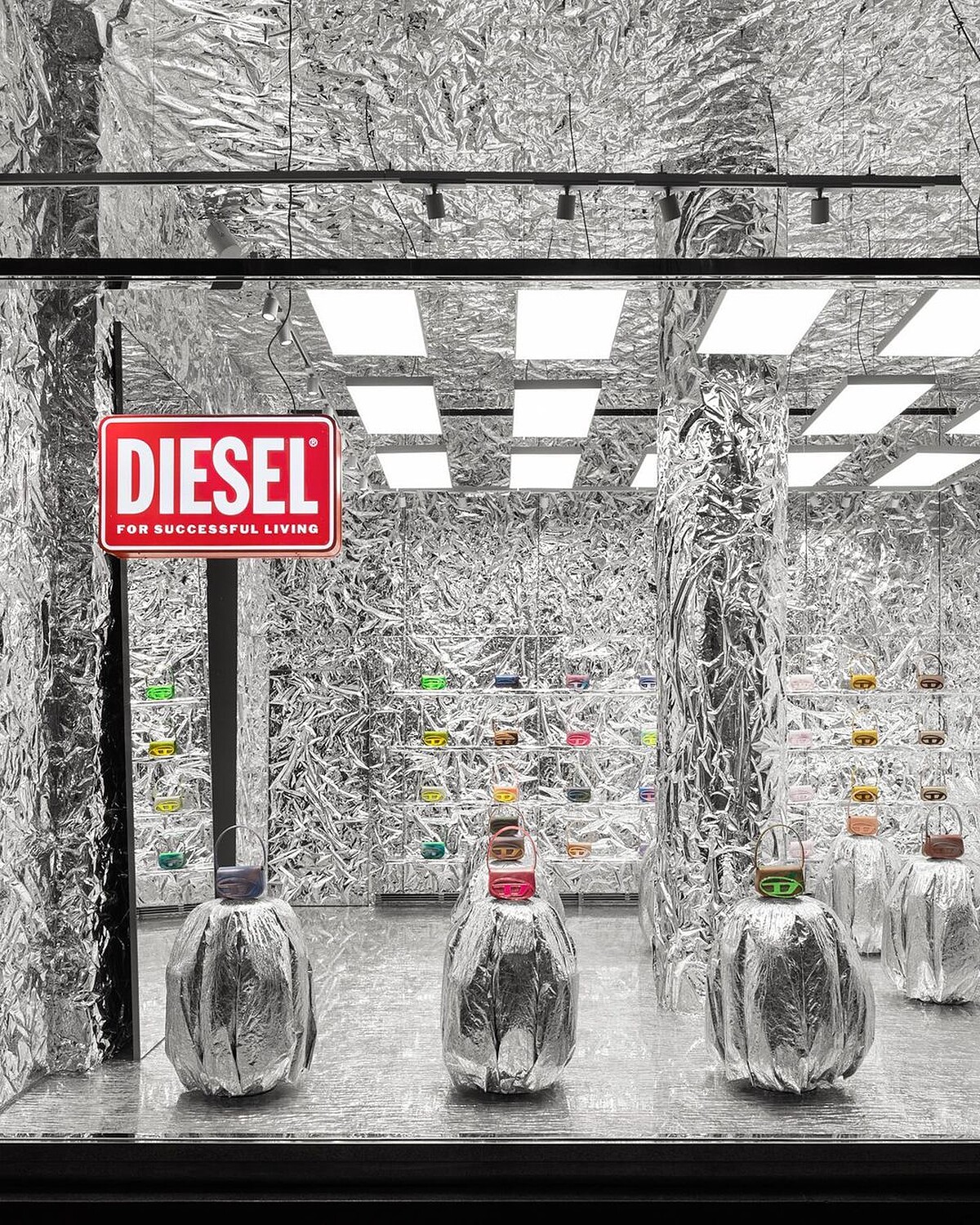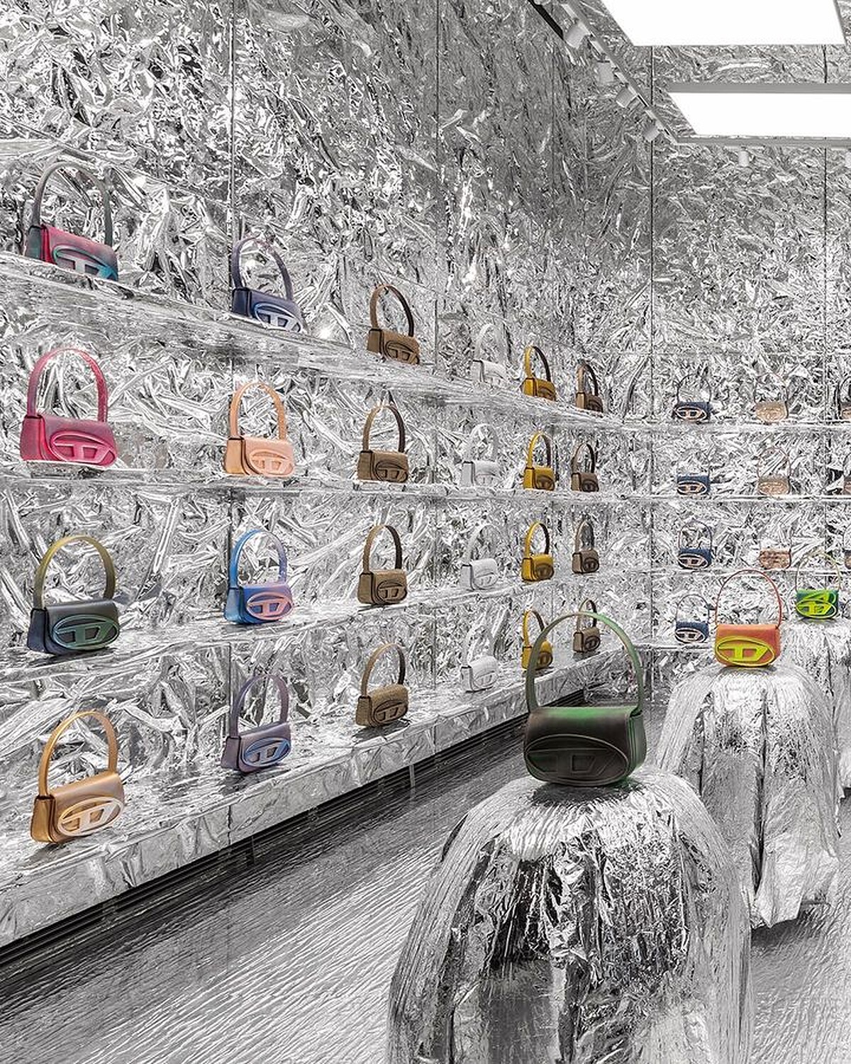 走進DIESEL 1DR專賣店讓人馬上陷入充滿未來感的銀色世界,店鋪四面與陳列架都像是被弄皺的鋁箔紙一樣刺眼,視覺超衝擊,光是這間店就擺出逾70款的1DR手袋,眾多的新顏色霓虹黃、玫瑰色、金色、蜜桃、萊姆綠、漸層銅色……也在此登場,對於到處缺貨而買不到的人來說,這裡簡直就是天堂,且如果你有選擇障礙,挑個一天一夜可能也逛不完。