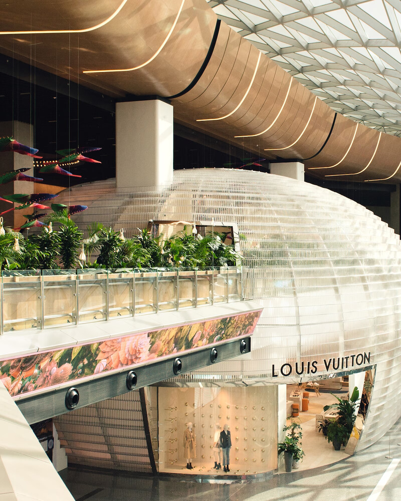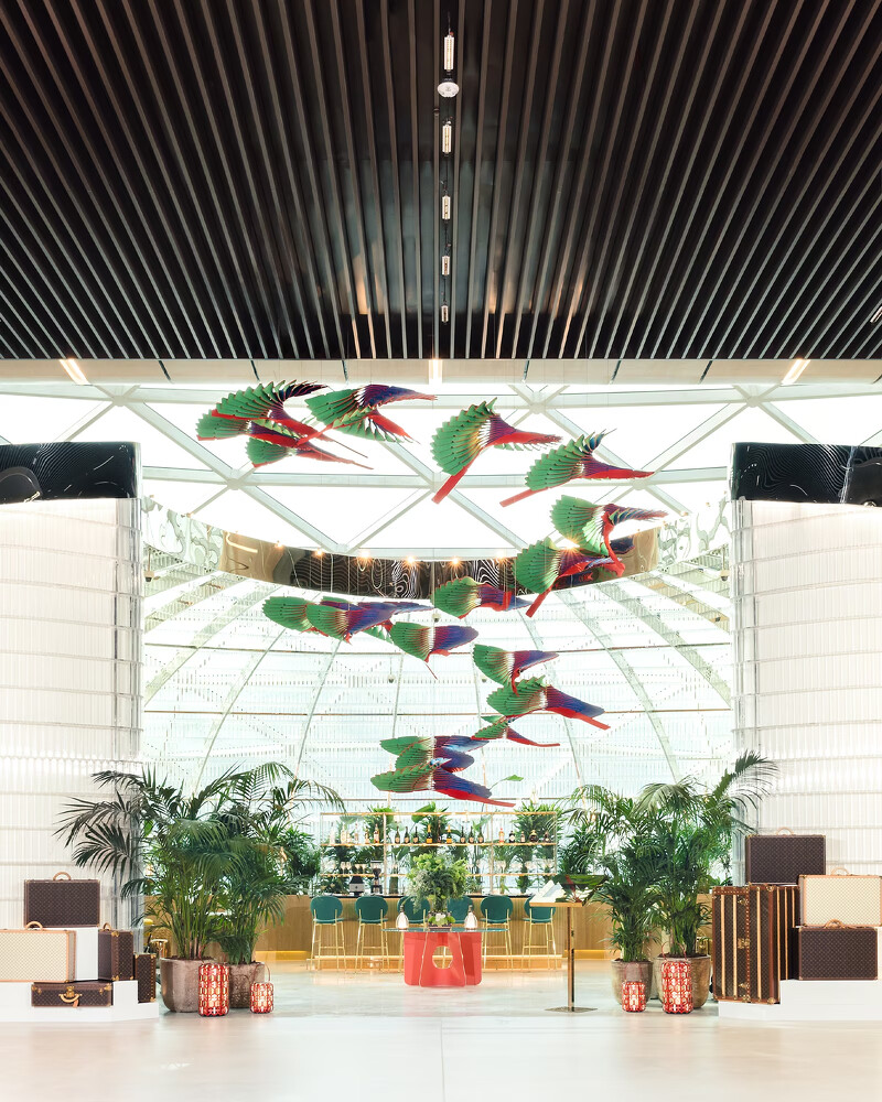 貴賓室的裝潢也藏有巧思,上Google Map看就知道,卡達位處於熱帶沙漠氣候,因此LV在裝潢色調上以繽紛的熱帶植物為主,像是入口處垂掛於空中的雕塑品,是請到瑞典設計工作室Atelier Oï設計,靈感取經於生活在熱帶的「鳳尾綠咬鵑」,讓人在室內也有像在絕美森林的既視感。