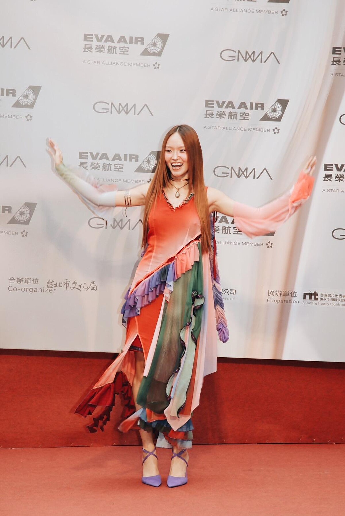 入圍最佳新人獎的LÜCY,今天以一身漸層撞色的飄逸雪紡荷葉邊長禮服登場,展現個人特色。