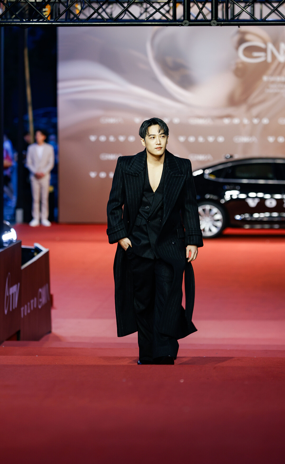 熊仔今年首度入圍歌王,紅毯造型上看得出來很認真看待,這回他穿上SAINT LAURENT的條紋西裝搭配翻領大衣,很是帥氣。