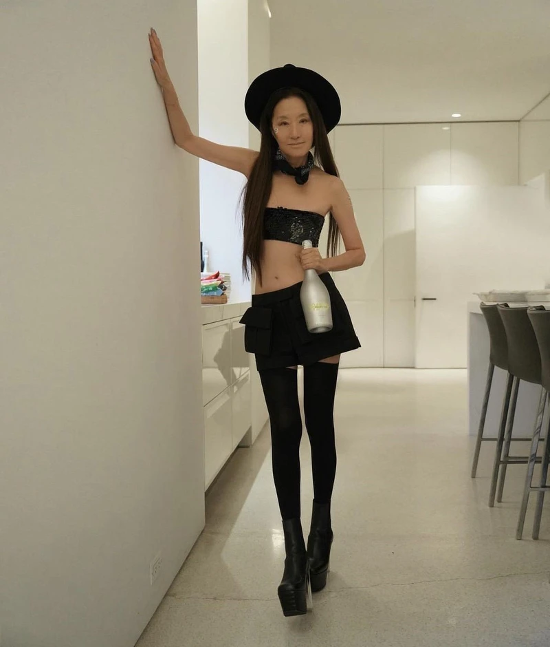 Vera Wang在她的74歲生日派對上穿了自家Vera Wang的訂製服,黑色亮片抹胸上衣布料非常少,搭配低腰的工裝風迷你裙,頗有Y2K風格的味道,看得出來Vera Wang對於流行新事物一直都保持開放的心態,也許這也正是她能如此年輕的原因之一。一雙筆直纖細的美腿用黑色長襪包覆住,再搭配一雙超高高跟鞋,派對上誰是主角一眼就知道了吧?