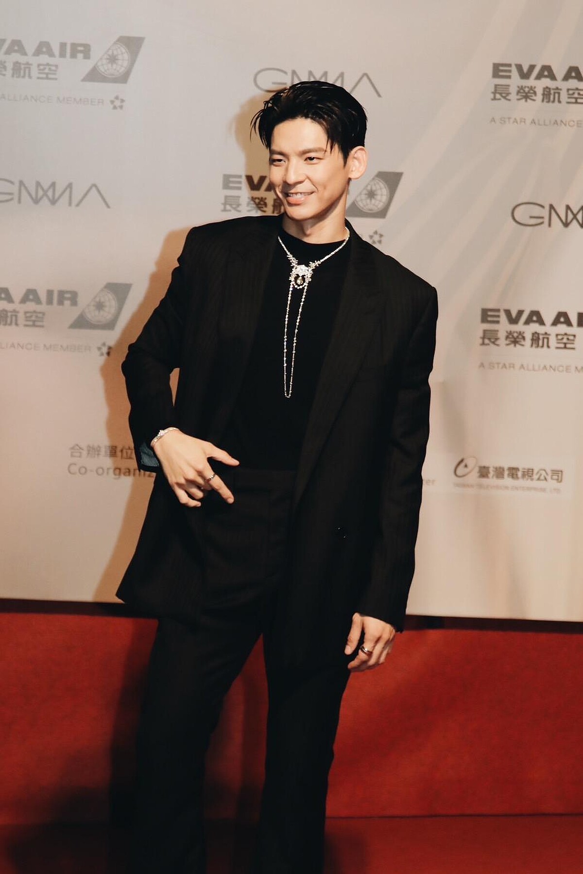 林柏宏以本屆金曲獎頒獎嘉賓的身份來到紅毯,並非音樂圈主角的他低調選擇CELINE HOMME的經典黑色西裝出場,沒想到依然是帥成了焦點,其中胸前的伯爵(PIAGET)Rose頂級珠寶系列18K白金黃色藍寶石項鍊可說是功臣,珠寶份量感點亮整體造型,讓他一舉一動都充滿紳士氣息。