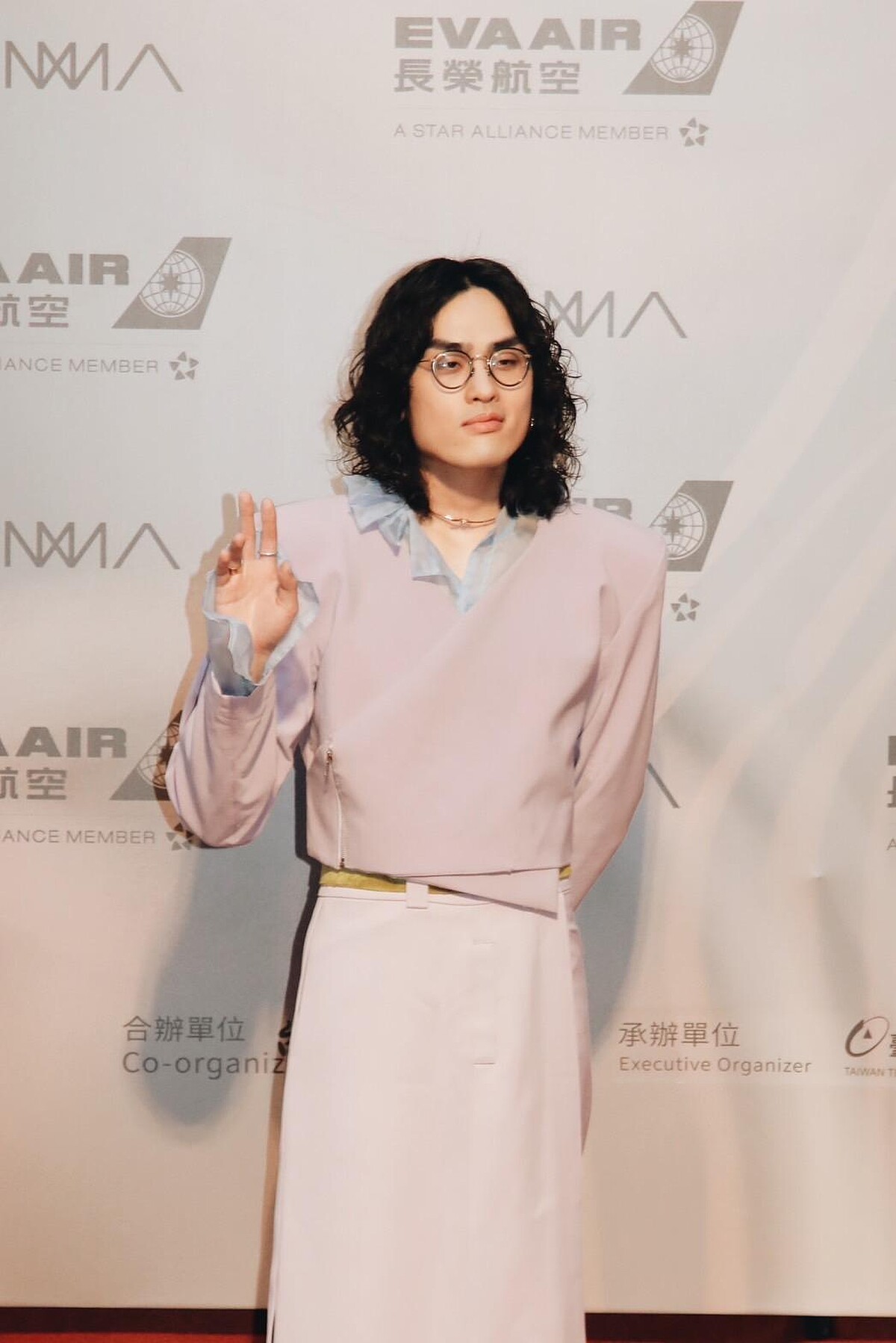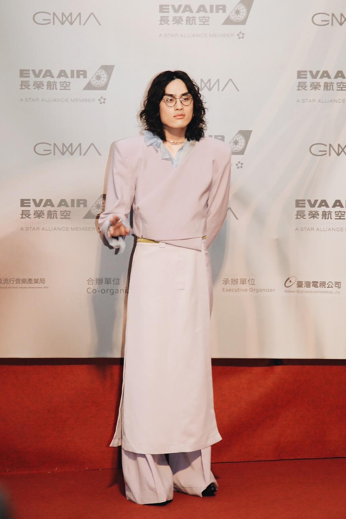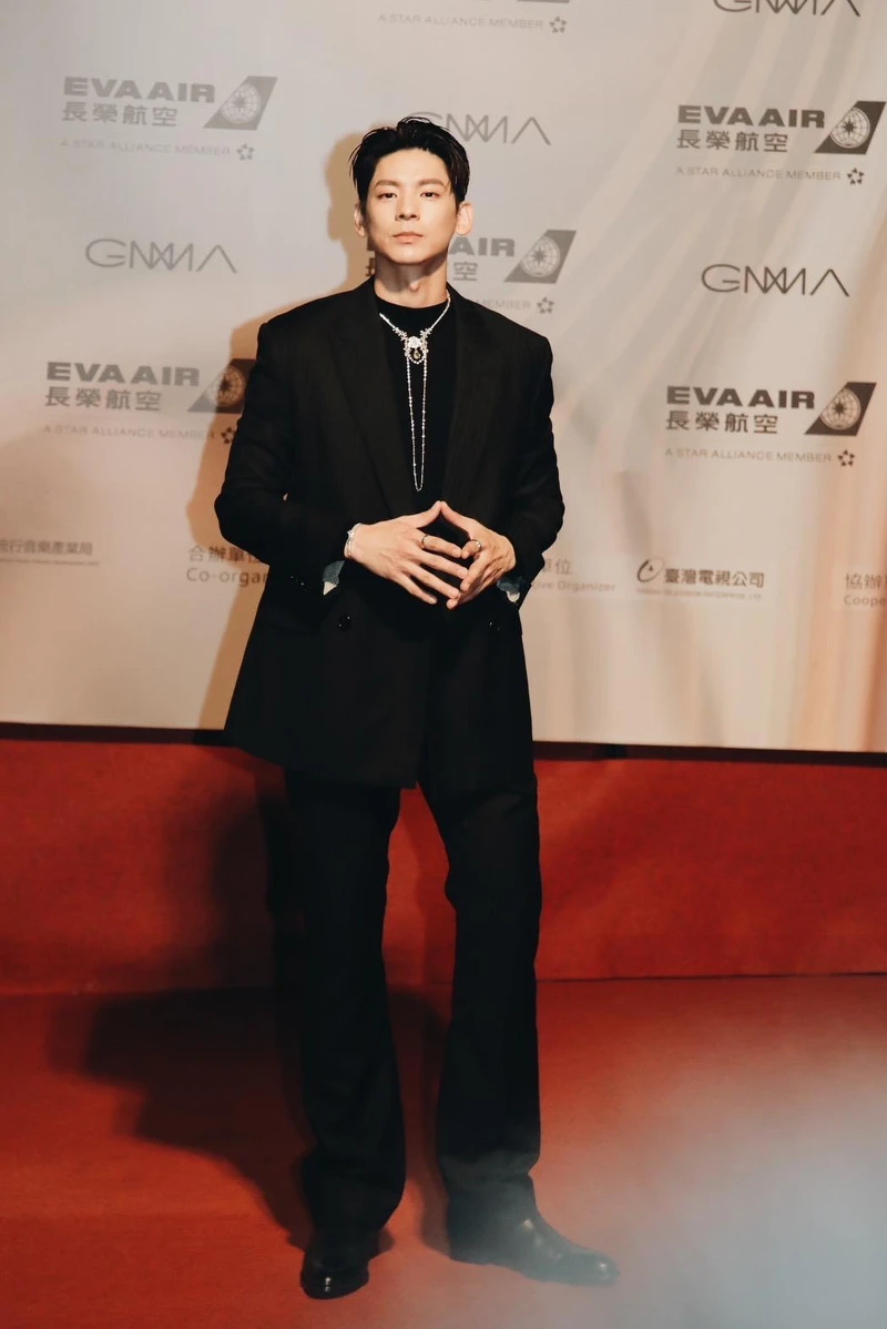 本屆金曲獎的黑馬鶴,除了唱歌好聽之外,身高185公分的他還是個不折不扣的衣架子!紅毯上的靈感造型很明顯的是延伸自專輯《TALENT》封面,淺粉紫色的墊肩西裝下,大膽選擇了同色系長裙、內搭長褲來讓視覺更延伸,袖口與領口的荷葉邊透紗則是讓整體造型的女性氣質更濃烈,中性風格在鶴的表現下被駕馭得非常好。