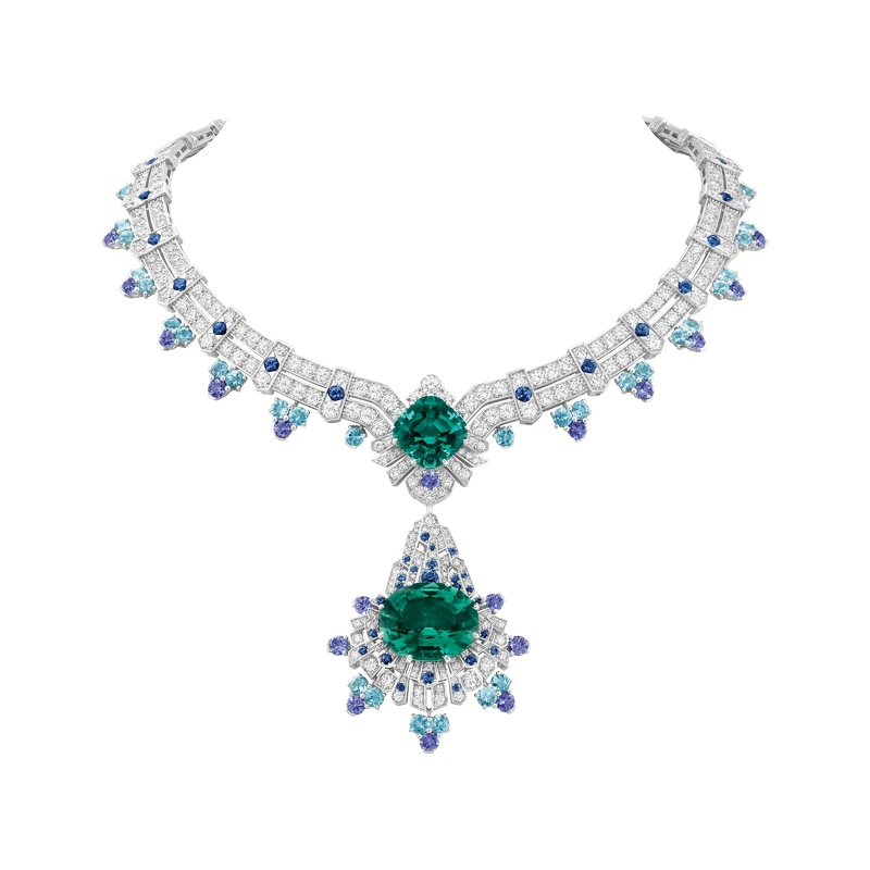 Diana可轉換式長項鍊名稱源自羅馬博爾蓋塞別墅(villa Borghese)庭院中的黛安娜神廟。鑲嵌大量祖母綠、藍寶石、鑽石和養殖珍珠,枕形切割的馬達加斯加藍寶石更險絲絨般的柔和藍調,與色調深淺不一的藍寶石、鑽石彼此和諧鳴奏。底部垂掛三顆養殖珍珠,中央的一顆連接一個極為精巧的玫瑰金廟宇,內置一顆藍寶石,其下飾有由珍珠和祖母綠圓珠串成的曼妙流蘇,圓珠由小至大,排列整齊有致。珠寶工匠在處理每個珠寶元素的鉸接時投入無窮匠心,確保項鍊柔軟靈活,能輕鬆轉換不同元素。項鍊的流蘇為可拆卸式設計,可隨心化作兩條長項鍊、一條短項鍊,以及一枚胸針和兩枚手鐲。