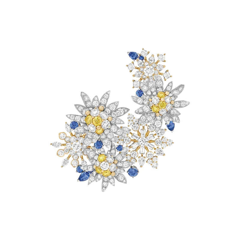 Van Cleef & Arpels梵克雅寶自創立以來,一直以纖麗的花卉灌溉創作靈感,Étoile des glaciers胸針則完美地描繪了高原野花燦爛盛開的曼妙仙姿。寶石以白K金和黃K金鑲嵌,濃郁的黃鑽與色澤柔和的藍色藍寶石互相輝映,烘托圓形、梨形、方形和欖尖形切割鑽石花瓣,為珠寶鍍上光影流轉的動人美態,優雅演繹花朵活力生機,如喬治•桑筆下迷人的場景,將人們引領至阿爾卑斯山脈的獨有春日氣息沉浸其中。