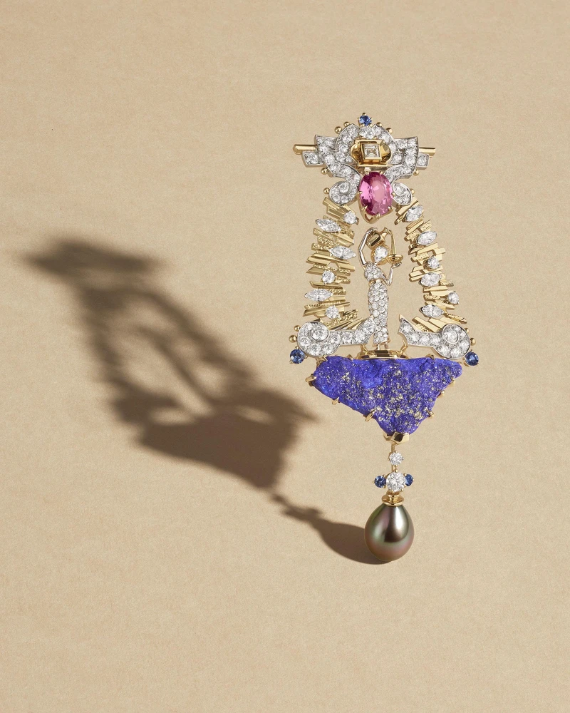 靈感源自由安東尼奧•卡諾瓦(Antonio Canova)打造的赫柏女神雕塑,圍繞女神的鏤空結構由精細拋光或帶有紋理的黃K金和明亮式及欖尖形切割鑽石交疊呈現如岩石般凹凸起伏的樣貌。粉紅色藍寶石、青金石上的點點星光讓胸針猶如嵌以珠寶的優美畫卷,引人浮想起查茨沃斯莊園花園中的人工瀑布上佇立的優雅亭子,懸垂於胸針下的一顆養殖珍珠則落下點睛之筆,詮釋歐洲藝術自古典至巴羅克時期對青春永駐的美好寓意。