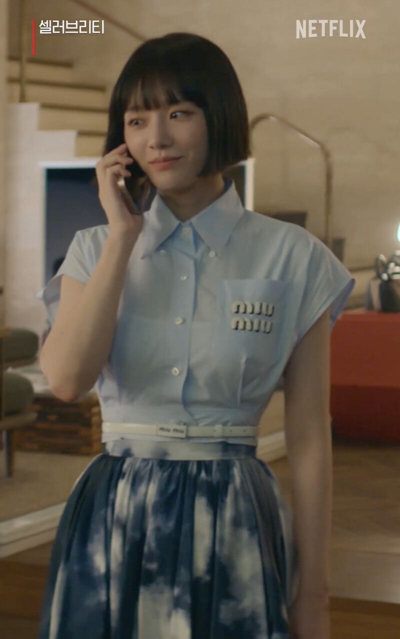 同樣是襯衫,小小的剪裁不同整體感覺就差很多。Miu Miu襯衫的袖子做成斜上的設計,讓手臂看起來更為修長、纖細;下擺部分則為縮腰細節,搭配上一間藍天白雲印花長裙,氣質小姊姊代名詞就是她!