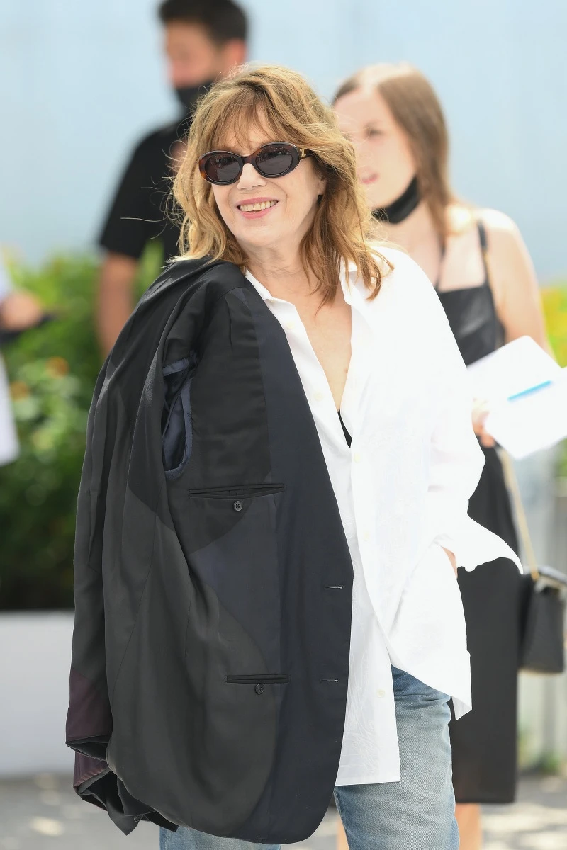 Jane Birkin作為一代時尚Icon,除了她的個人魅力之外,她與年齡無關的時尚感更是佔有重要的一部分,在2021年現身坎城影展為自己的紀錄片《Jane by Charlotte》宣傳時,當時74歲的Jane Birkin一身寬鬆的白襯衫、西裝外套搭配牛仔褲,還有一副好看的墨鏡就踩上紅毯,一點也不費力的就魅力十足!