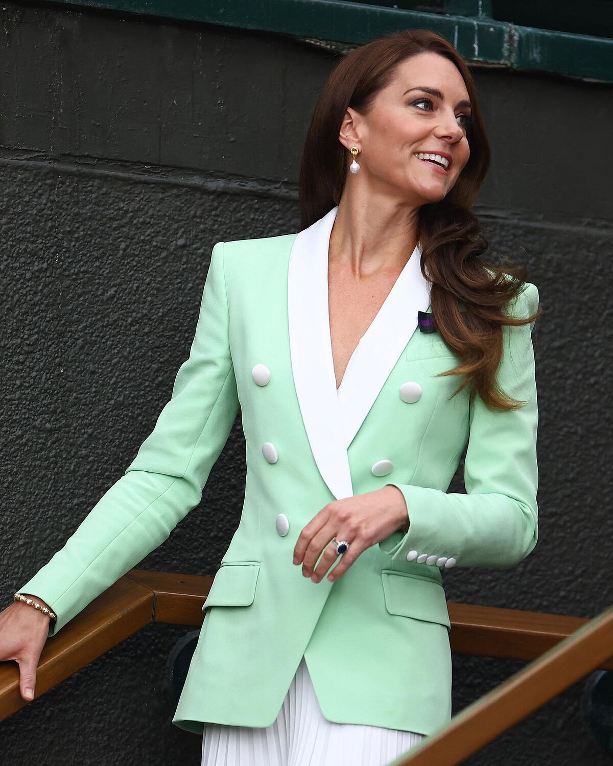 開賽第二日,凱特王妃身穿Balmain經典六釦長版西裝外套搭配百褶長裙,薄荷綠色與白色裙裝的組合恰巧符合溫布頓主題綠、白色系,復刻自80年代的剪裁設計與她的氣質相輔相成,並佩戴傳承自黛安娜王妃的藍寶石戒指,展現高貴與優雅。