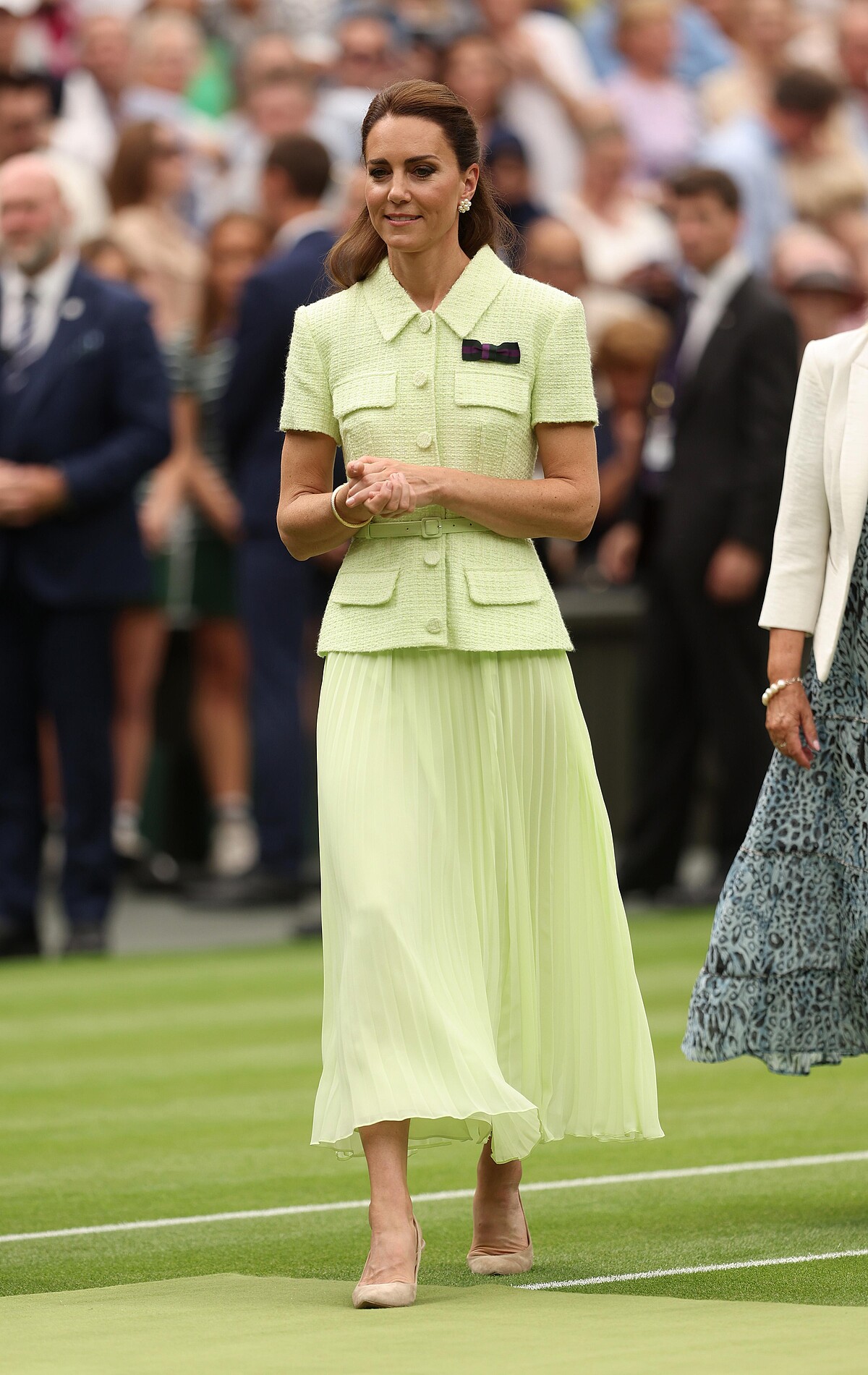 7月15日女子單打決賽,凱特王妃穿著Self-Portrait的黃綠色毛呢西裝與百褶紗裙,呼應網球的明亮色彩。