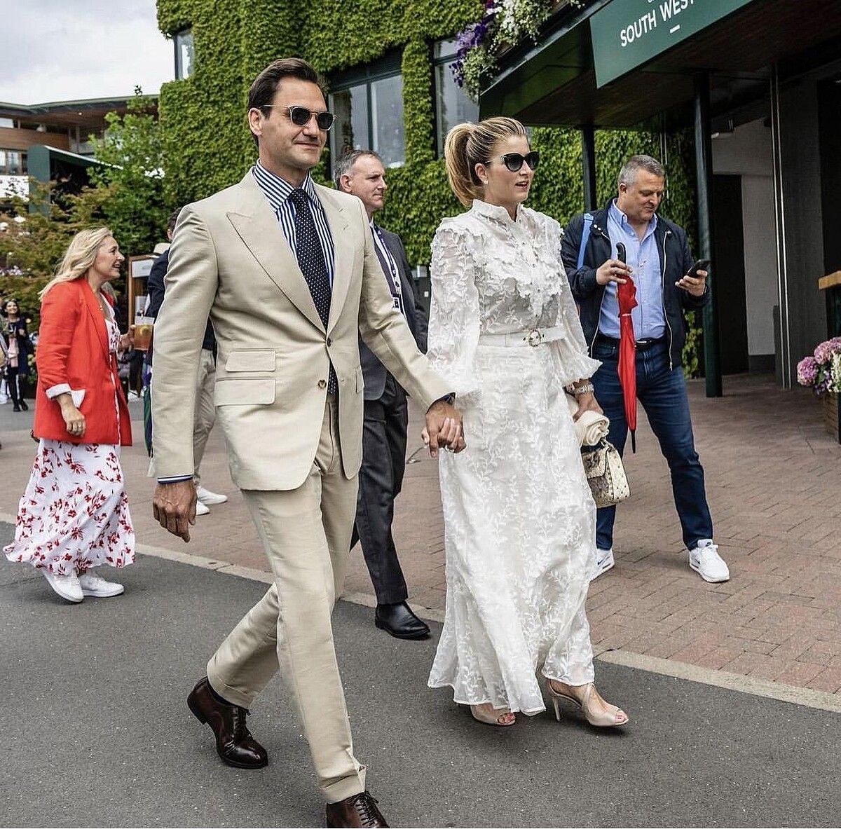 站在費德勒身旁,Mirka身穿一件植物刺繡的白色連衣裙,出自Zimmermann 2022 年春季膠囊系列。