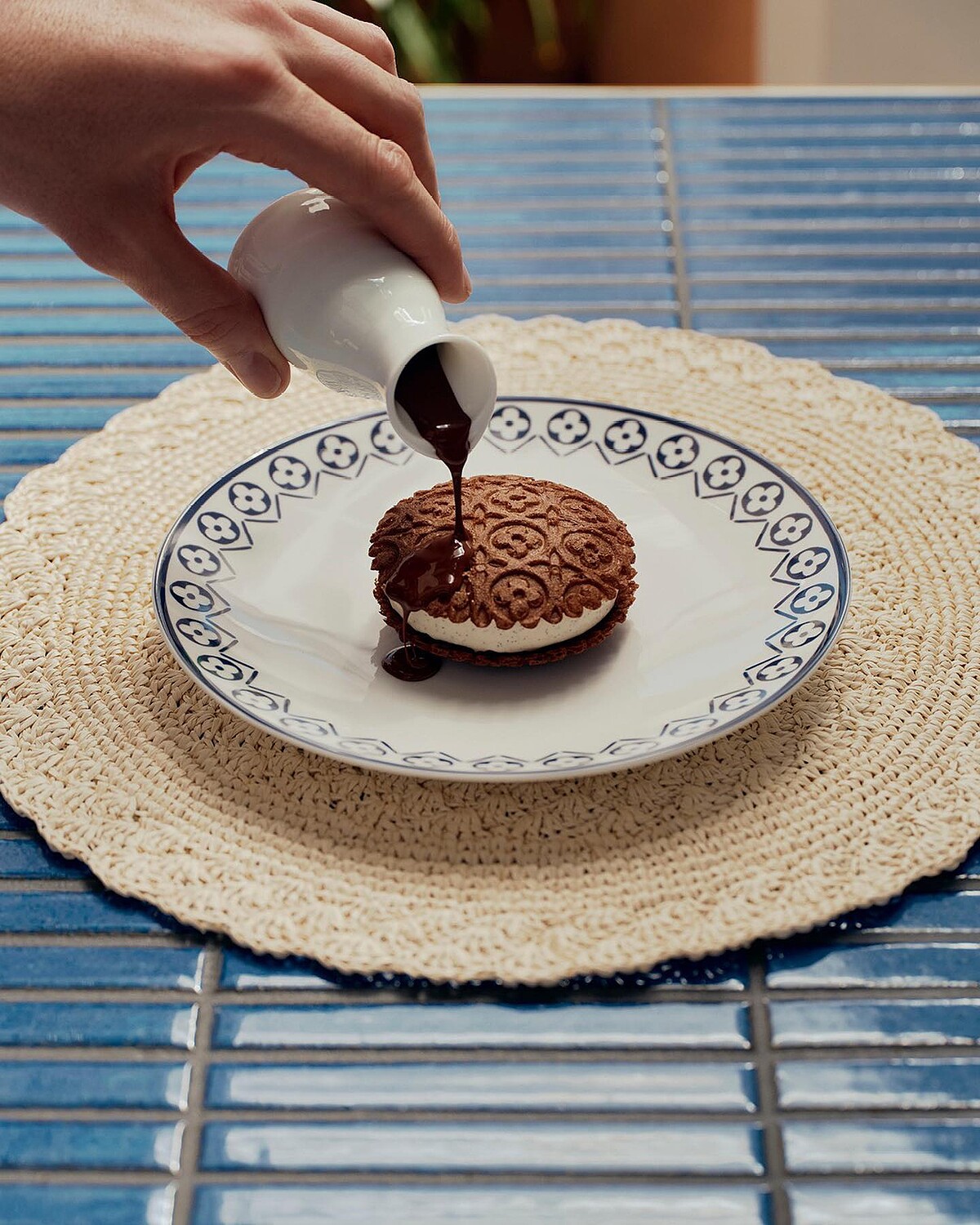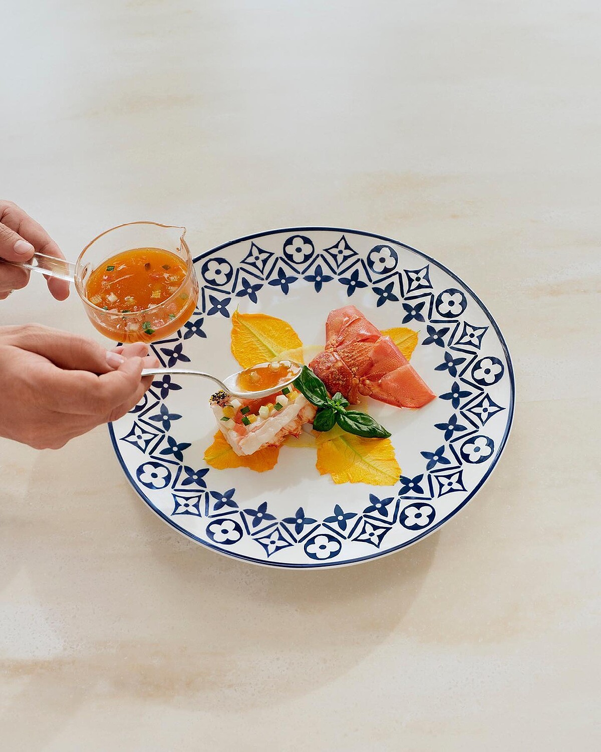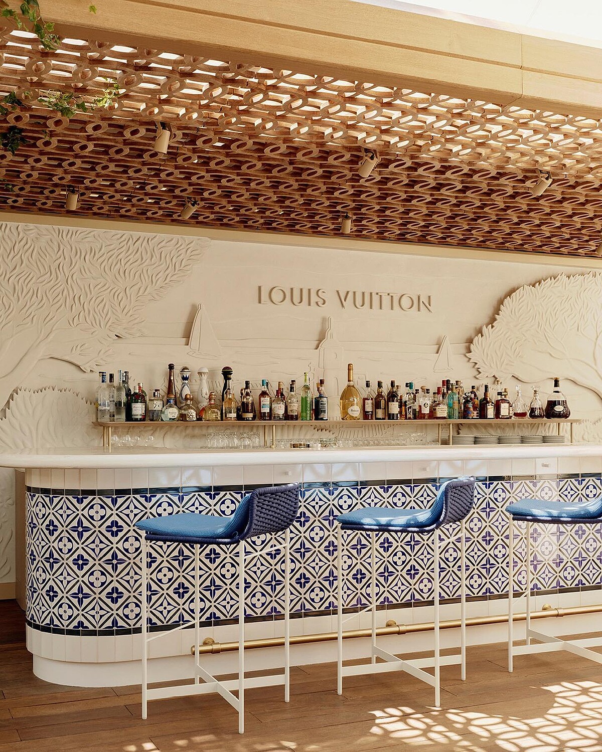 暑假期間,不少歐洲人都會到聖多羅佩享受陽光、海洋,一邊品著美酒,一邊讓美景洗滌自己心靈。本次的裝潢便呼應如是的愜意氛圍,取材渡假系列《LV by The Pool》的色調,將餐廳換上療癒的藍、白配色,藤編座椅加上Objects Nomades的鏤空燈飾,細節控如路易威登,就連背後的植栽牆上也都綴上Damier Ebene的老花圖樣,坐在這裡用餐簡直太夢幻!