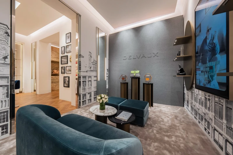 全新專門店以歐式宅邸風格注入比利時風采,運用簡約俐落的金屬線條劃分空間,牆面紋理靈感則是來自於古典歐洲宮廷,搭配鏤空的金屬陳架,與Delvaux巴黎Saint-Honoré旗艦店的設計相呼應。