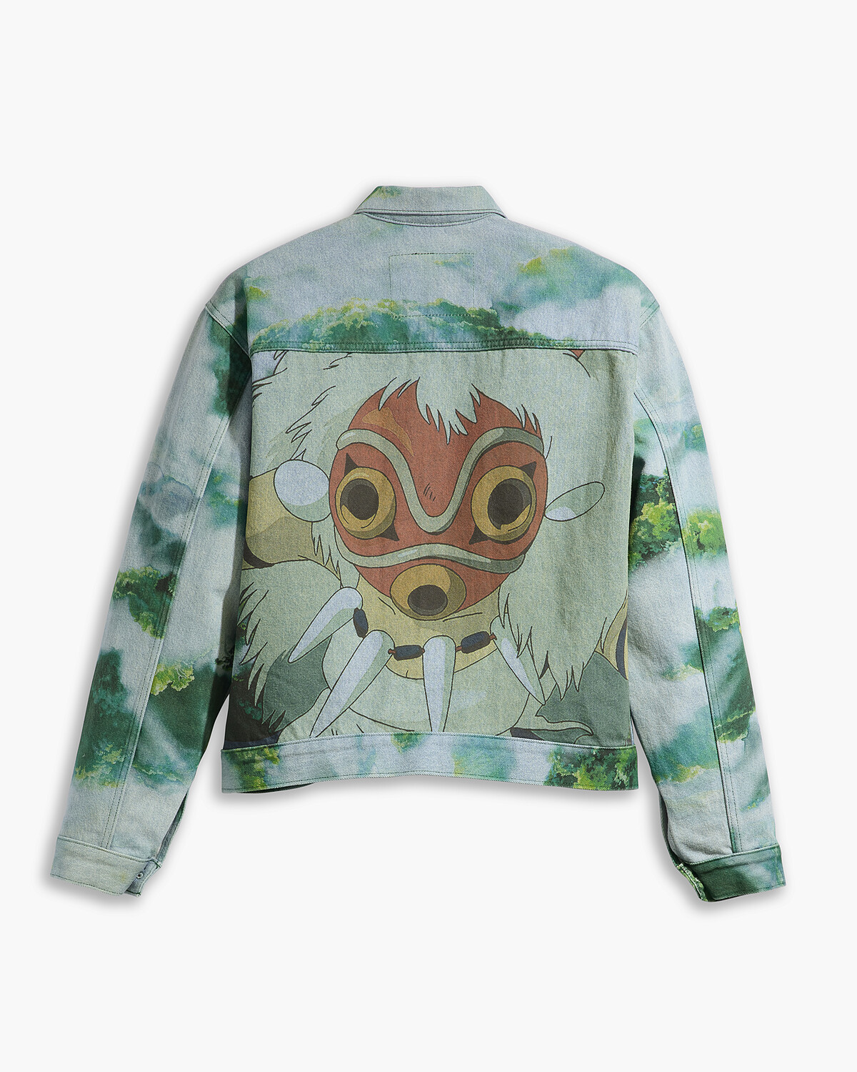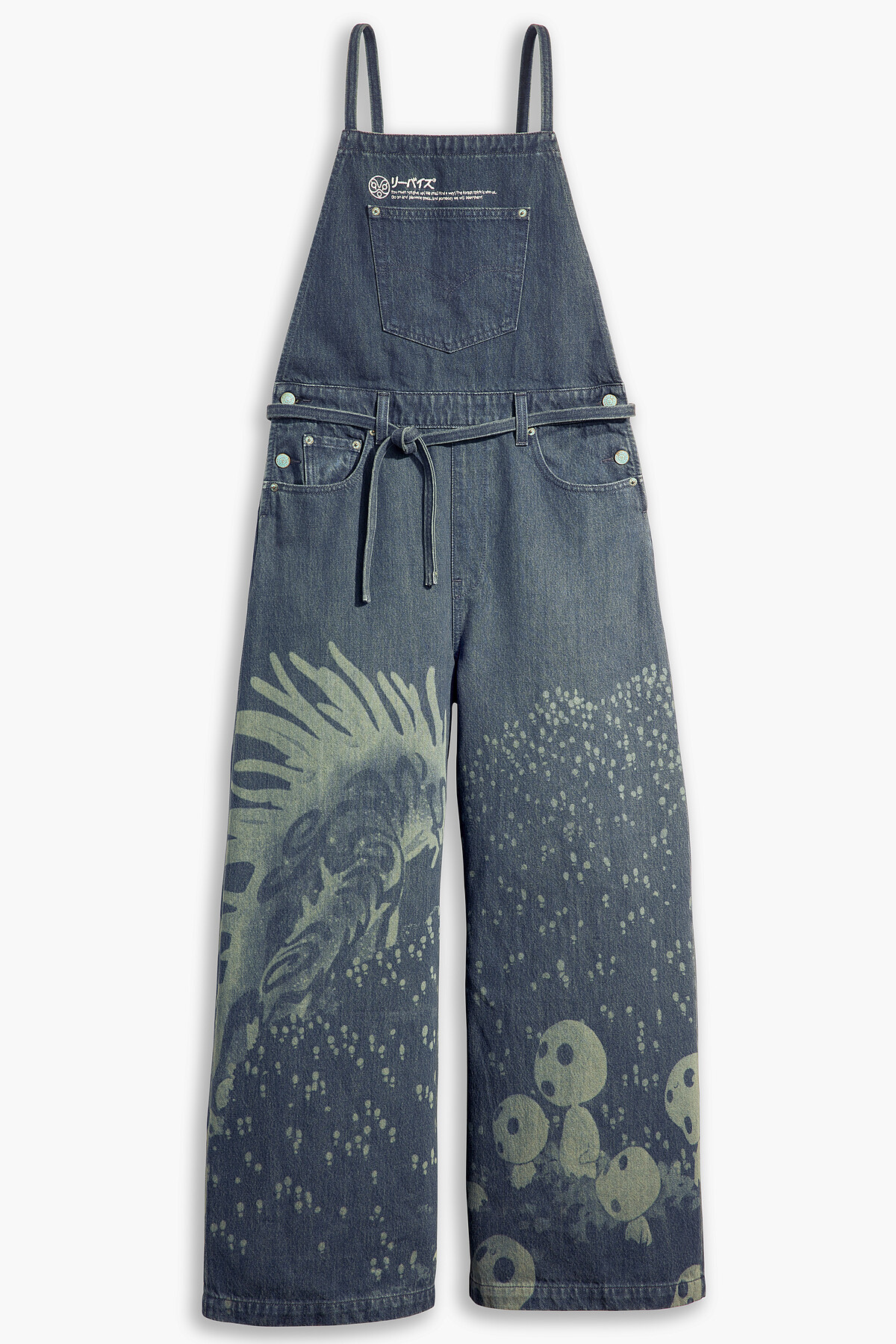 Levi's X Princess Mononoke系列在丹寧布料上重現宮崎駿細膩的手繪風格,讓《魔法公主》電影中壯闊的森林成為背景,角色們則一一躍上諸多單品:小桑與白狼莫娜的形象用於丹寧夾克外套與丹寧短褲上,阿席達卡則是501® ’93 丹寧褲的新主角,一件可愛的丹寧吊帶連身褲兩條褲管分別採用山獸神與小精靈的圖案;而很受歡迎的小精靈,也出現在靛藍色布料的和服式丹寧外套和小配件上。在此系列單品中,都能看到以小桑戰鬥面具為靈感設計的聯名專屬標籤、吊牌以及刺繡設計,手寫字體則特別有吉卜力的電影風格。