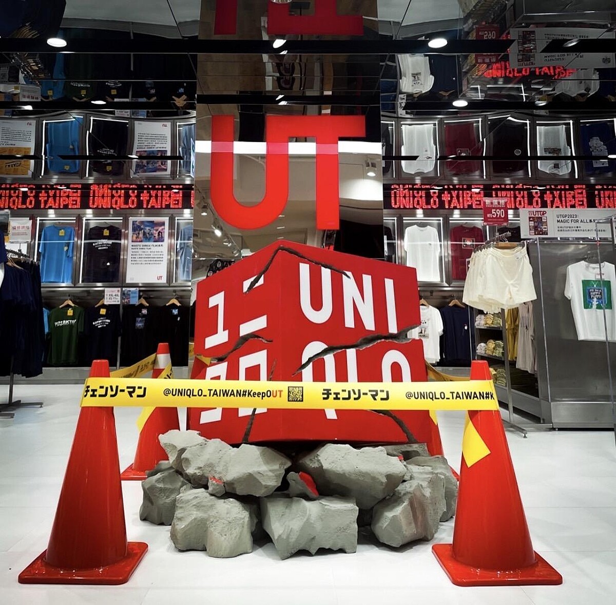 為替Uniqlo X 《鏈鋸人》聯名系列宣傳鋪路,Uniqlo這回悄悄把官方頭像換成了「破碎的Logo」,且不只有社群響應,日本UNIQLO原宿店和台灣的UNIQLO TAIPEI旗艦店,也都擺設了被破壞的Logo裝置,就像是被淀治的電鋸砍過一樣,此外還特別印製限量鏈鋸人號外報紙,讓粉絲們更投入動畫的世界,也成功達到吸引劇迷的目的。