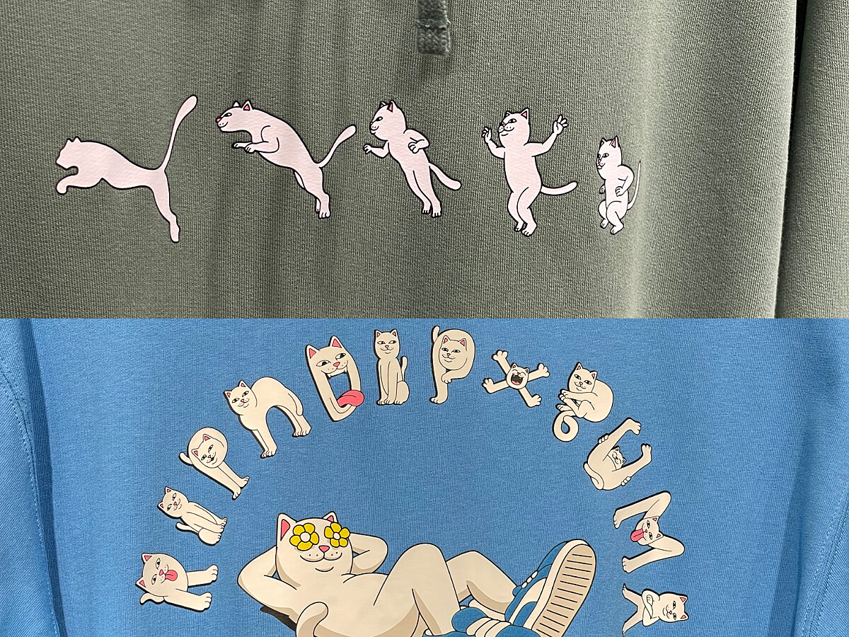 PUMA旗下SELECT系列與RIPNDIP攜手以「變形」作為本次合作的核心主題,以輕鬆幽默的方式傳遞滑板街頭文化的精神。像前面說到的,雙方都是以貓科動物為品牌形象,他們便乾脆讓中指貓以「物種演化」的方式慢慢變形成PUMA豹,創造出很有玩味的聯名圖案,運用在服裝、帽款上。