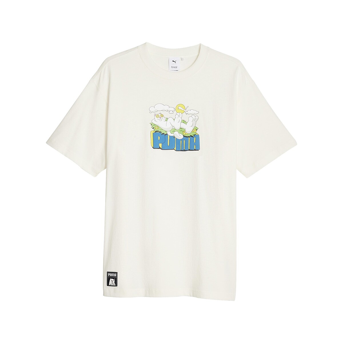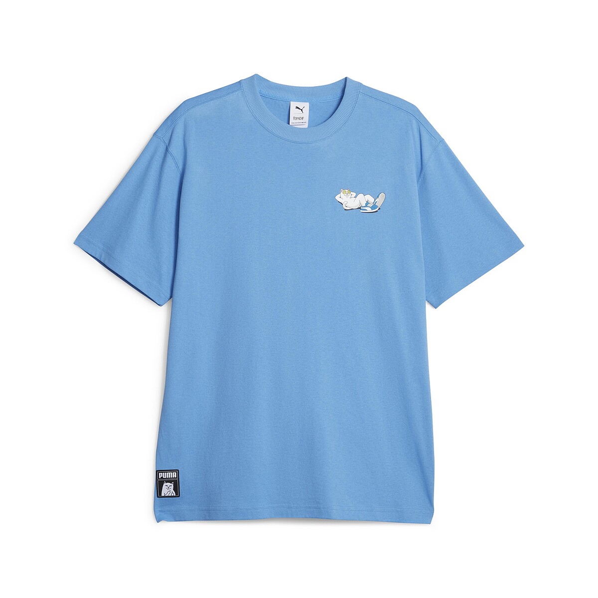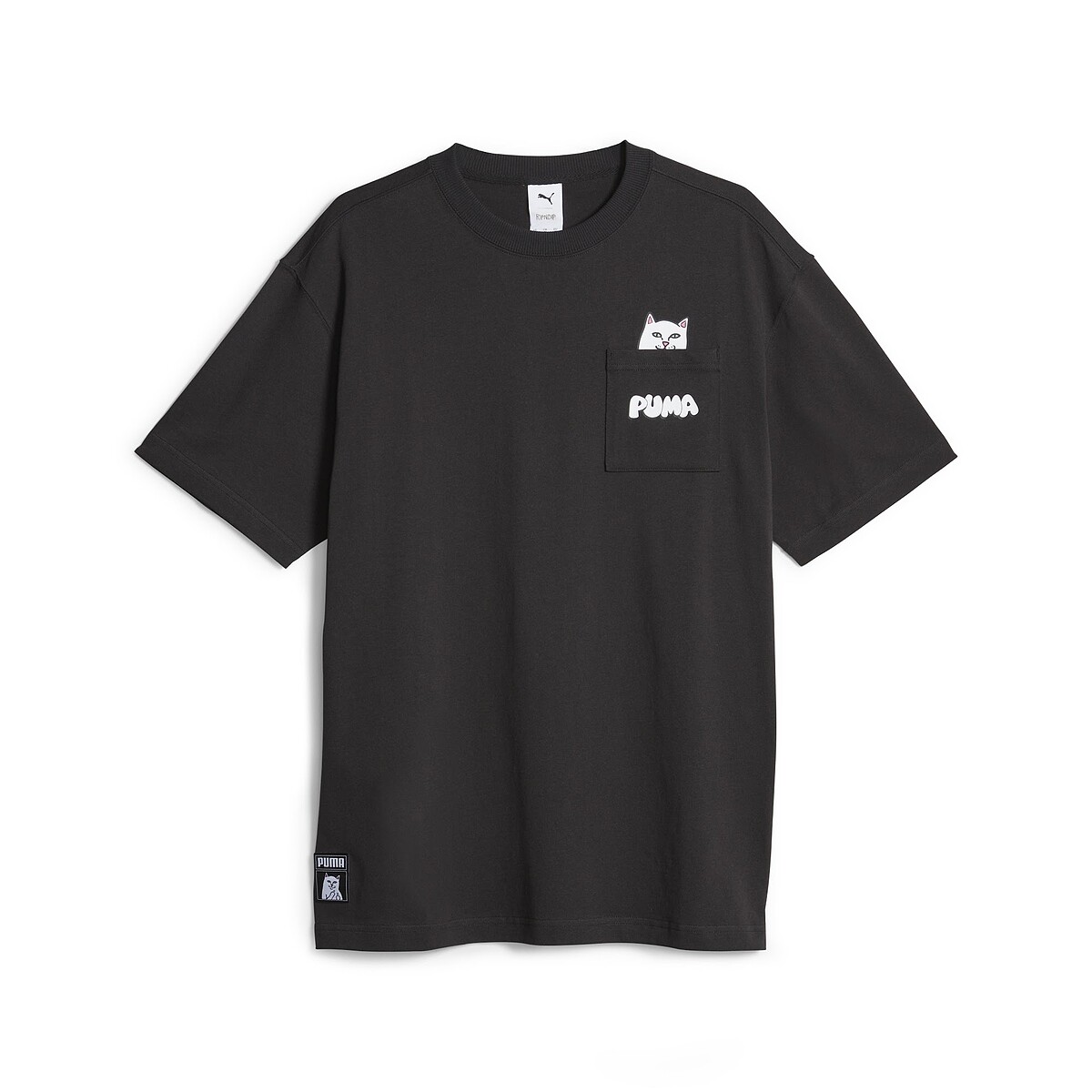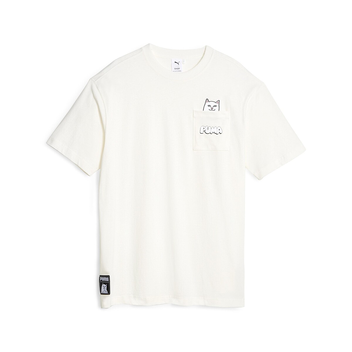 另外,RIPNDIP x PUMA聯名中的一項T恤單品編輯特別推薦,在寬鬆街頭風版型的T恤上,白貓飾於胸前口袋的上緣,當你把口袋翻開會看發現,牠一如既往的對你比著中指,這個惡趣味的小設計深得編輯的心,特別可愛!