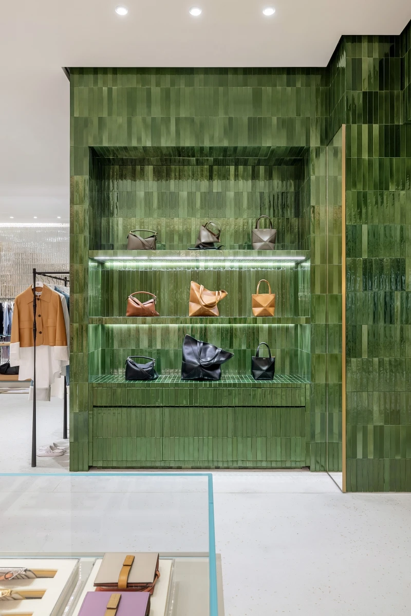 LOEWE台中新光三越女裝專門店在8月重新開幕,改裝後的專門店內,以藝術與時尚工藝的結合,在78平方米的空間內呈現CASA LOEWE沒有距離感的藝術藏家空間,在整體呈現暖色調的店內以西班牙手工製作的清爽綠色及奶油色的磁磚為牆面,地上鋪著John Allen的羊毛地毯,Gerrit Thomas Rietveld的椅子,以及日本設計師野口勇設計的懸掛式紙燈,十足的好品味展現。