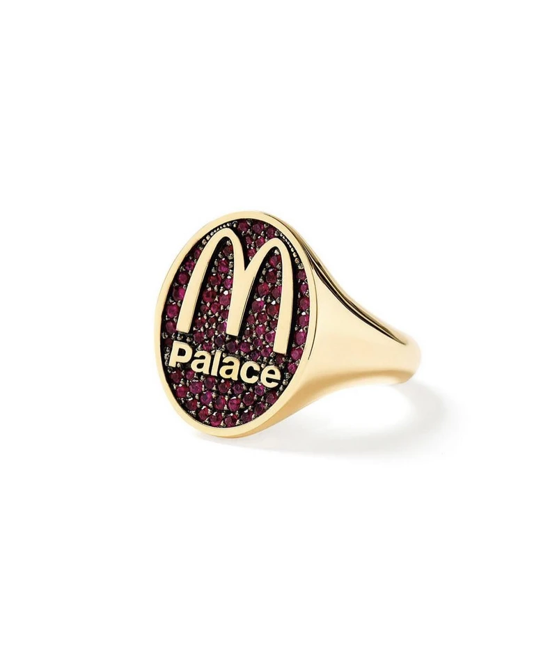 如今McDonald’s X Palace Skateboards的聯名系列已陸續完整公開,最先曝光的單品為這只圓形金戒指,由紅寶石替雙方品牌的Logo襯底,有種土豪式的炫耀感,同時又潮到出水!