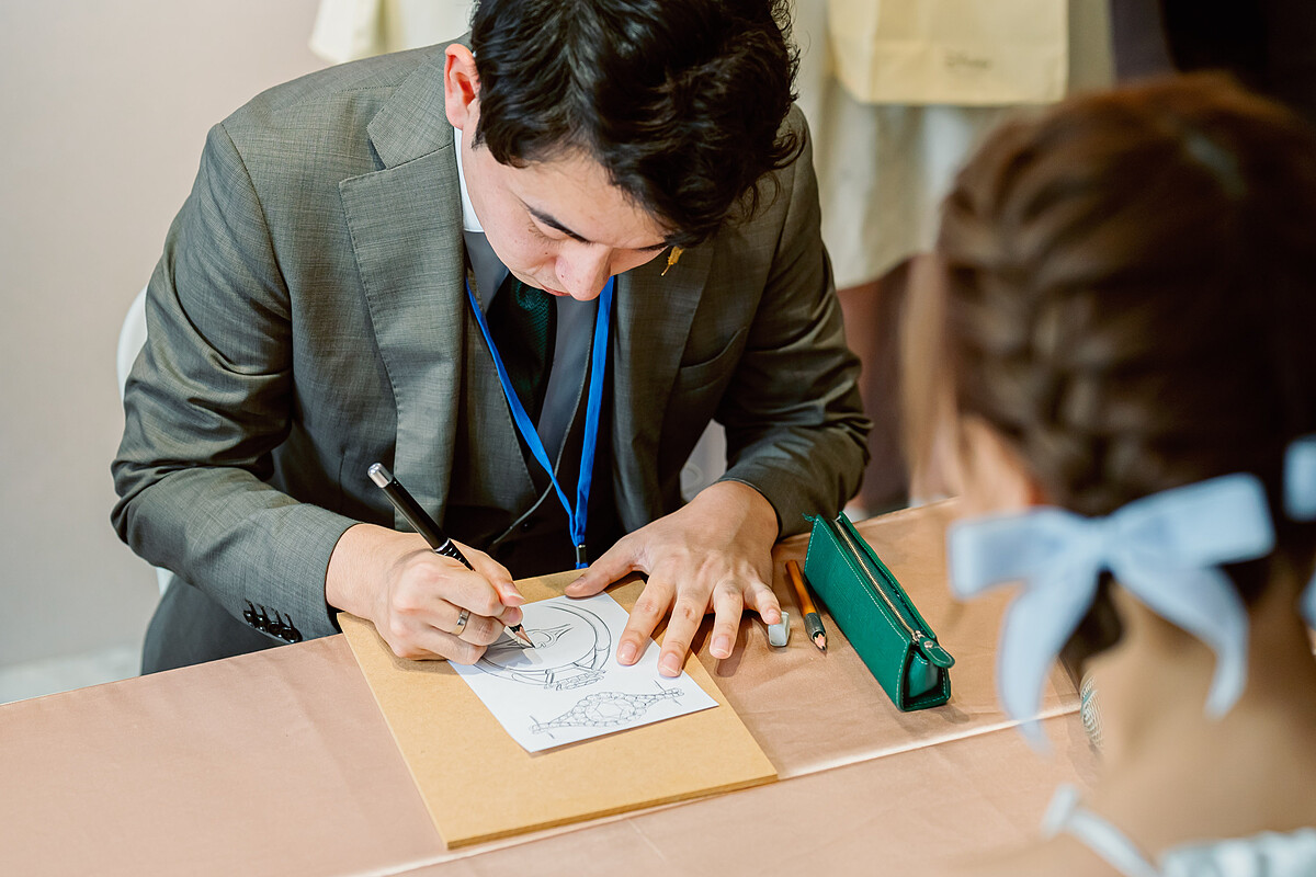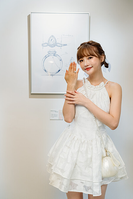 在日本擁有超高人氣的K.UNO,不只吸引新人客製婚戒、情人對戒,想為自己打造獨一無二飾品風格的消費者,也相當倚重K.UNO珠寶設計師的專業建議。K.UNO的品牌精神在於——「新人在挑選戒指的時候,絕對不能妥協」,因此「客訂製」是品牌一路以來相當堅持的目標。發表會這天,K.UNO也特別安排珠寶設計師野田先生親自為Nina手繪專屬戒指,沒想到在短短10分鐘內,野田先生就在畫紙上勾勒出以Nina最愛的白雪公主為靈感的設計鑽戒,戒指細節還包括Nina的名字,甚至蘋果被咬一口的意象也被細心放入,讓在場所有圍觀的受邀嘉賓都透出躍躍欲試的心動!