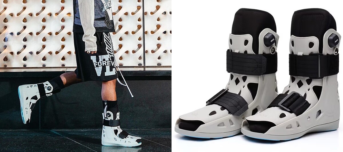 MSCHF在2022年10月份時,曾推出一雙「AC1」鞋款,其外型毋庸置疑,正是改良自你我心中所聯想到的醫療護具,透過冰冷的灰白色塑膠殼與尼龍束帶組合而成,這樣的靈感其實是對於時尚產業不夠重視鞋履舒適度、只在乎外型夠不夠炫的一種嘲諷,象徵著盲目追隨流行,有一天你會被自己絆倒骨折(?)