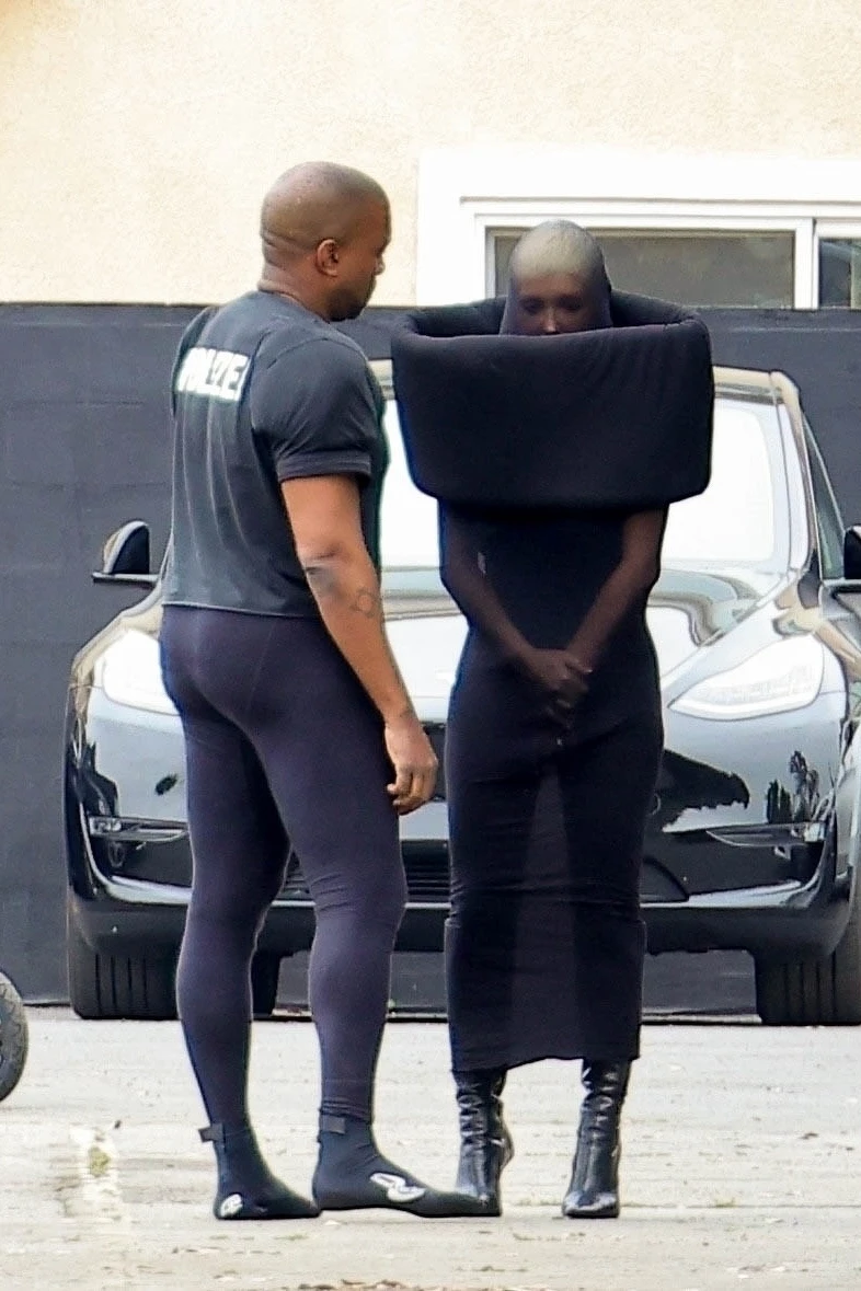 Bianca身穿著一件黑色連身長洋裝,內裡從頭到腳被黑色薄紗包裹,特別的是在肩膀至耳下的部分,被環狀的黑色超高高領軟墊罩住,讓老公Kanye West的VETEMENTS檻欖球大墊肩T-Shirt搭配Legging的造型都不夠看!