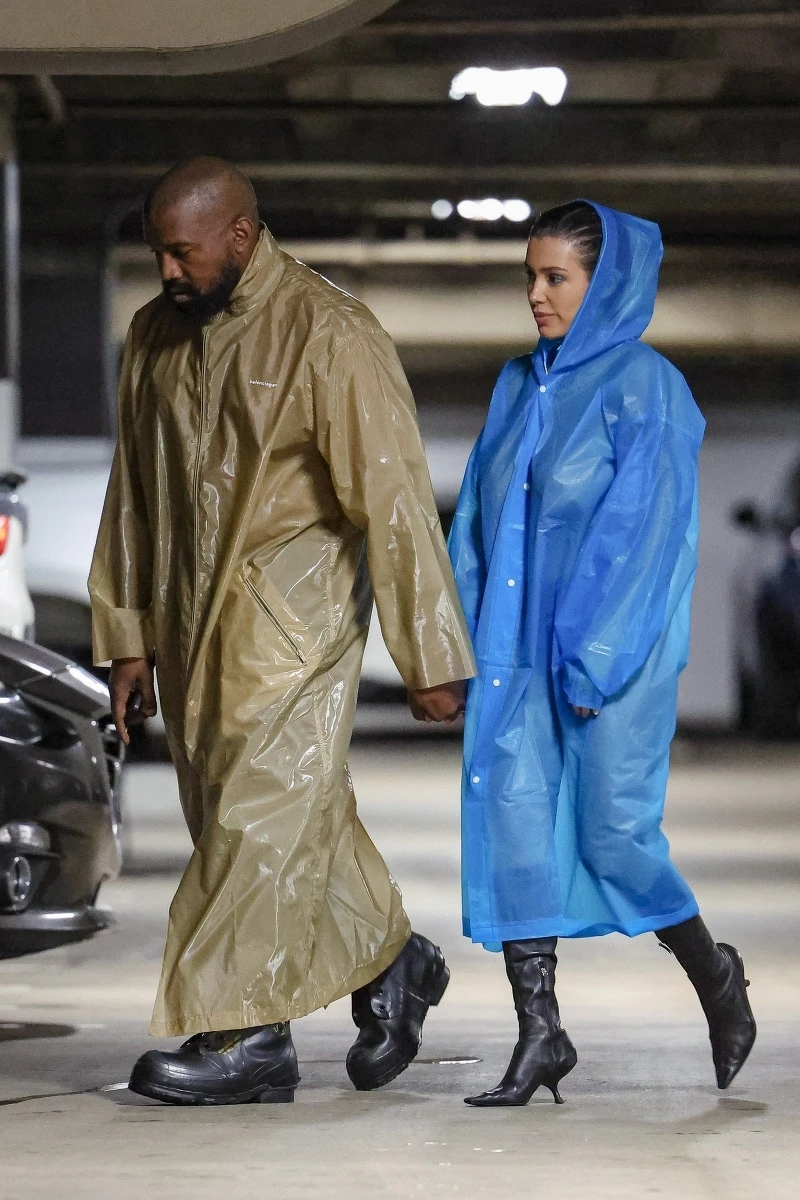 2023年最愛裸色的女人,Bianca Censori近期的喜好似乎又改變了,近日他被目擊跟Kanye兩人穿著雨衣出門,Kanye的雨衣之下是全套的運動套裝,而Bianca一身藍色雨衣的造型看似正常,但仔細一看雨衣內並沒有穿上衣,下身也僅穿著一件黑色熱褲與長靴,此套造型也讓美國網友們反應熱烈表示「跟以前一樣有穿像沒穿!」