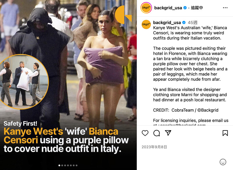 從小在澳洲長大的Bianca,墨爾本大學建築學系畢業後,從事建築相關工作,在移居洛杉磯後加入Kanye團隊,更因此與他展開戀情,而在今年初閃婚後的Bianca整個人幾乎畫風大變,雖然以前的穿搭也是性感時髦,不過與Kanye的造型除了性感,還日漸突破尺度,讓許多美國網友認為她就像被Kanye 掌控的芭比娃娃,甚至兩人前陣子出遊義大利威尼斯時,出格的服裝與行為還引起抵制,沒想到在最新被目擊的照片上Bianca直接抱著枕頭出門了!