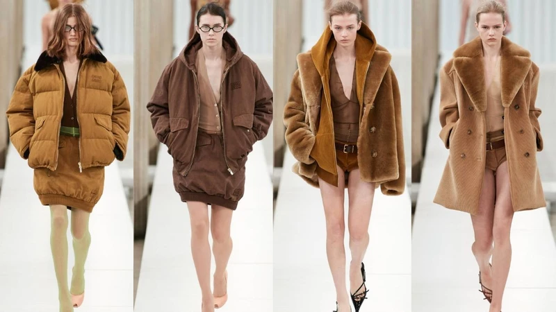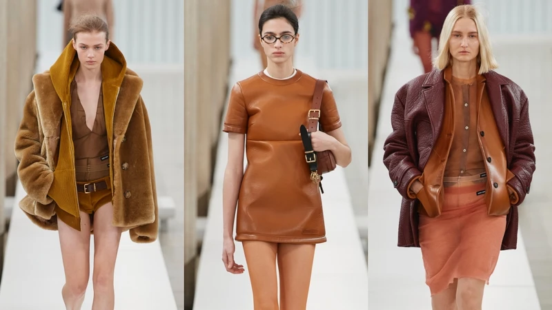 2023秋冬時裝週上,也不難看到許多品牌推出相關穿搭,例如 Miu Miu 的伸展台上,就可以看到設計師大量的運用「棕」的相近色,如深棕、薑黃、卡其、駝色、焦糖色,透過不同明暗和材質組合一起,定義整體氛圍與風格。在統一色調下,若此時加入一抹鮮豔的綠、黃,或其他色彩,也能瞬間抓人眼球。