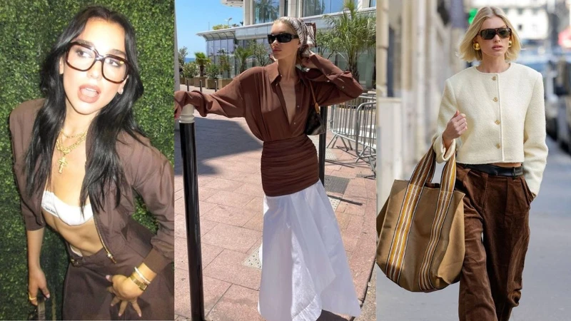 偏深的「美拉德」咖色,藉由白色來讓整體更顯休閒、輕鬆。女星 Dua Lipa 就以一身咖色西服套裝,內裏加上白色 Bra top,整體偏運動女孩風。瑞典超模 Elsa Hosk 則是在棕色襯衫包臀裙底下疊穿白色罩裙,配上同色系頭巾,度假風十足。另一套則是以較鬆垮的燈籠芯牛仔褲,上身佐以奶白色合身版型毛呢外套,打造柔和的對比穿搭。